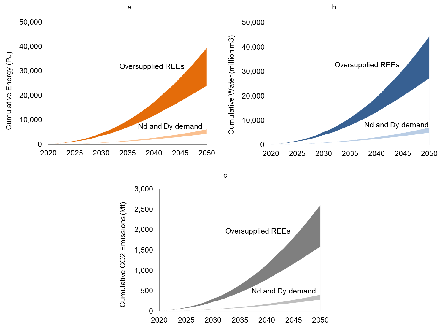 Fig. 1: Cumulative energy, water, and CO2 emissions associated with Nd and Dy production and oversupplied REEs in a high and low demand scenarios and an average energy, water, and CO2 intensities of metals production