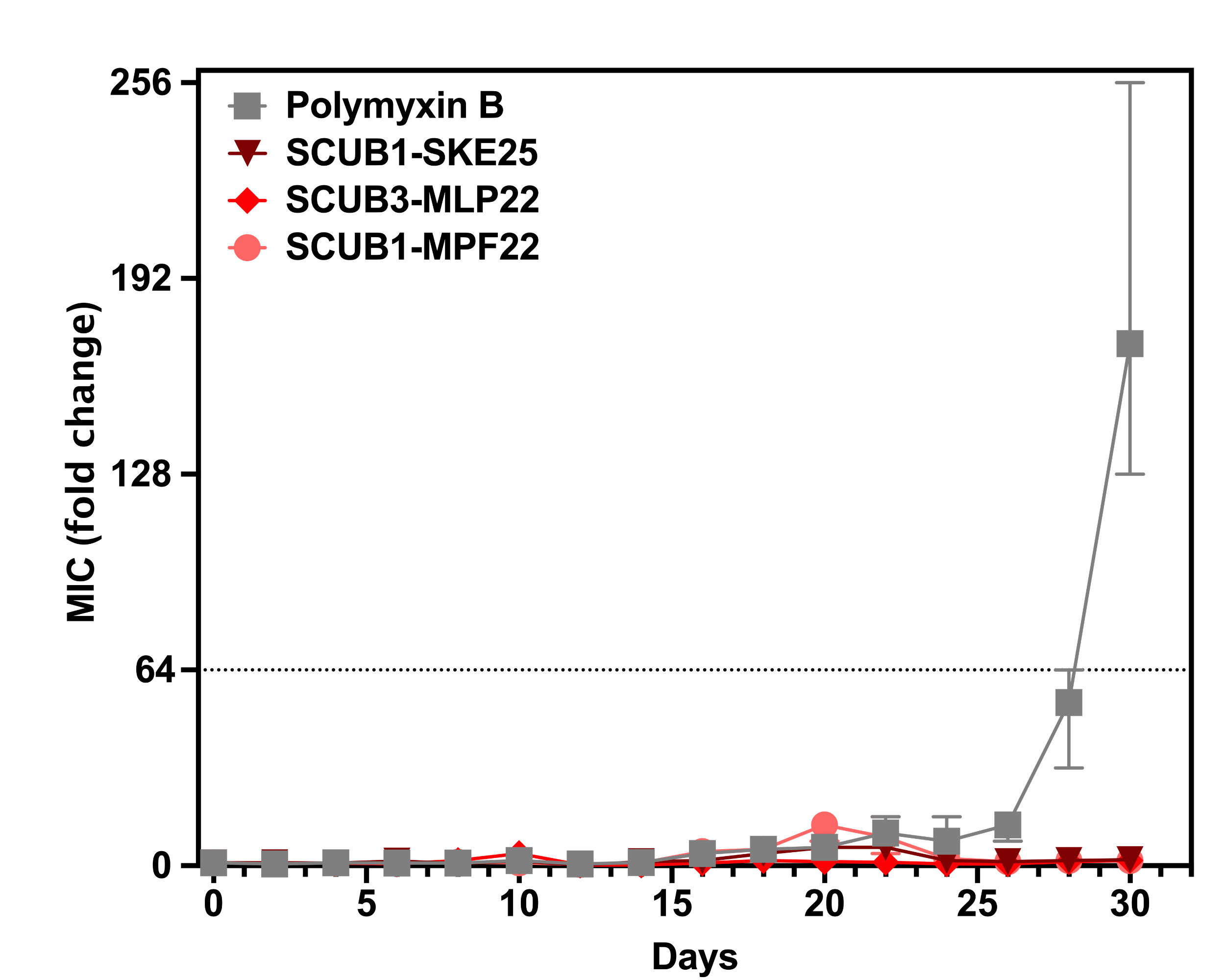 Fig. 2. Resistance development studies of encrypted peptides. Evolution of resistance by A. baumannii to encrypted peptides derived from the CUB domain (red) or polymyxin B (gray) after 30 days of serial passaging in liquid nutrient broth. Peptides and antibiotics were used at sub-inhibitory concentrations. Cells were passaged every 48 h.
