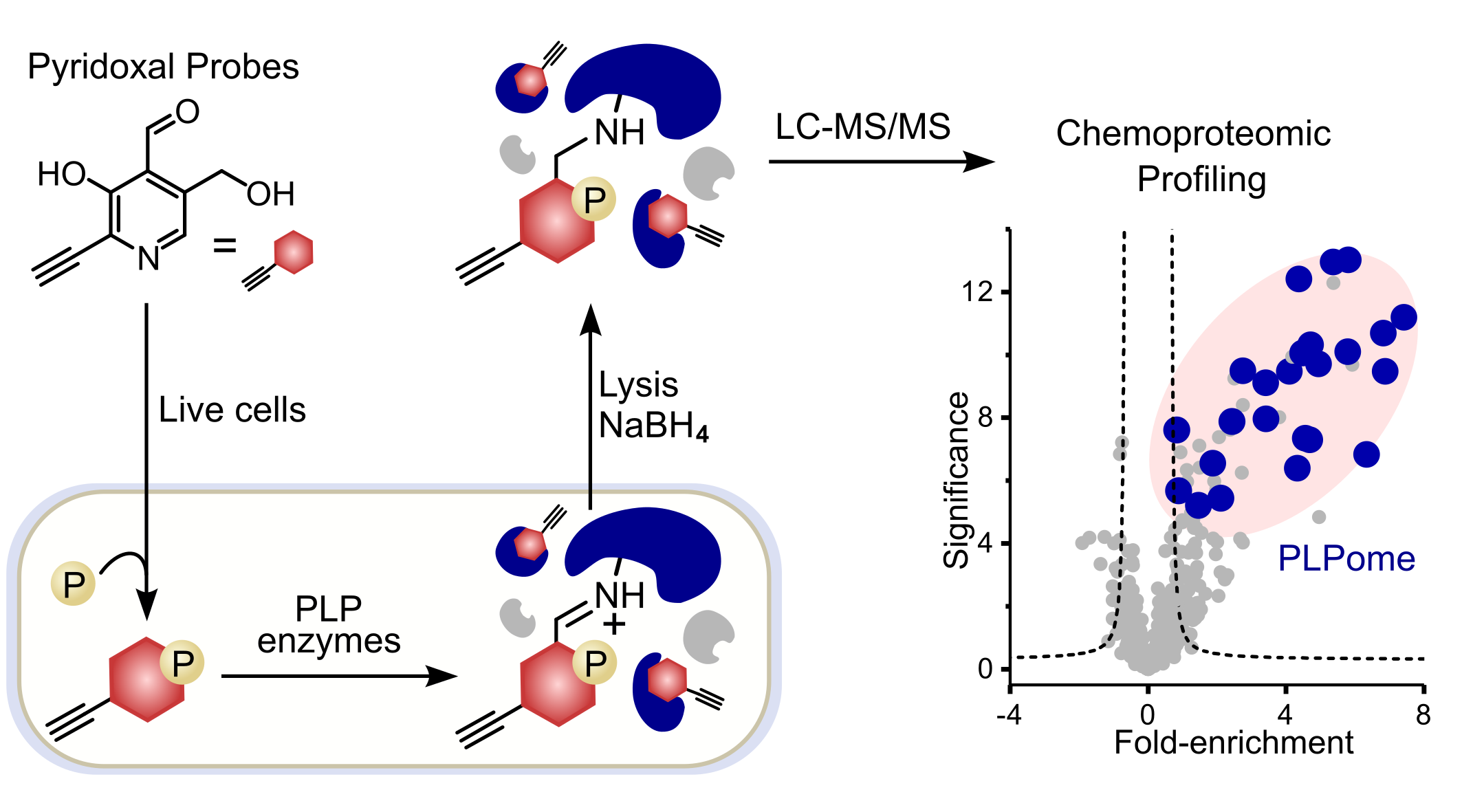Because of the diversity and evolution of PLP-DEs, resulting in five different fold types, their classification by sequence homology with known enzymes is difficult. In order to profile known and so far unassigned PLP-DEs, we developed a novel chemo-proteomic strategy for the global characterization of the PLPome of living cells. This strategy was inspired by activity-based protein profiling (ABPP) and involved the use of PL-derived probes.