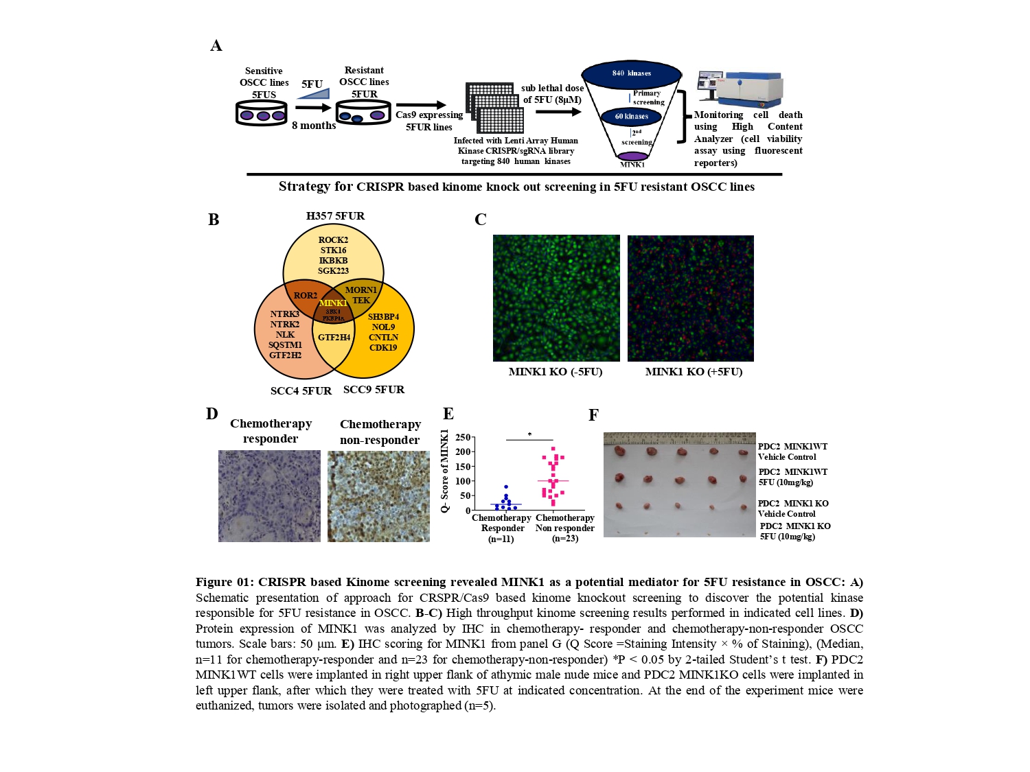 From the CRISPR/Cas9 based kinome knockout screening, performed in three different 5FU resistant lines developed in our laboratory conditions, MINK1 was found to be the top ranked kinase that can be targeted to re-sensitize drug resistant cells to 5FU (Fig. 1A-C). Analysis of clinical samples demonstrated significantly higher MINK1 expression in the tumor tissues of chemotherapy non-responder as compared to chemotherapy responders (Fig. 1D&E). The nude mice xenograft experiments indicate that knocking out MINK1 restores 5FU mediated cell death in chemoresistant OSCC (Fig. 1F). To confirm the finding from the kinome screening, cell viability and cell death assays were performed which suggest that knocking out MINK1 (MINK1 KO) significantly resenitized chemoresistant cells to 5FU (Fig. 2A&B).
