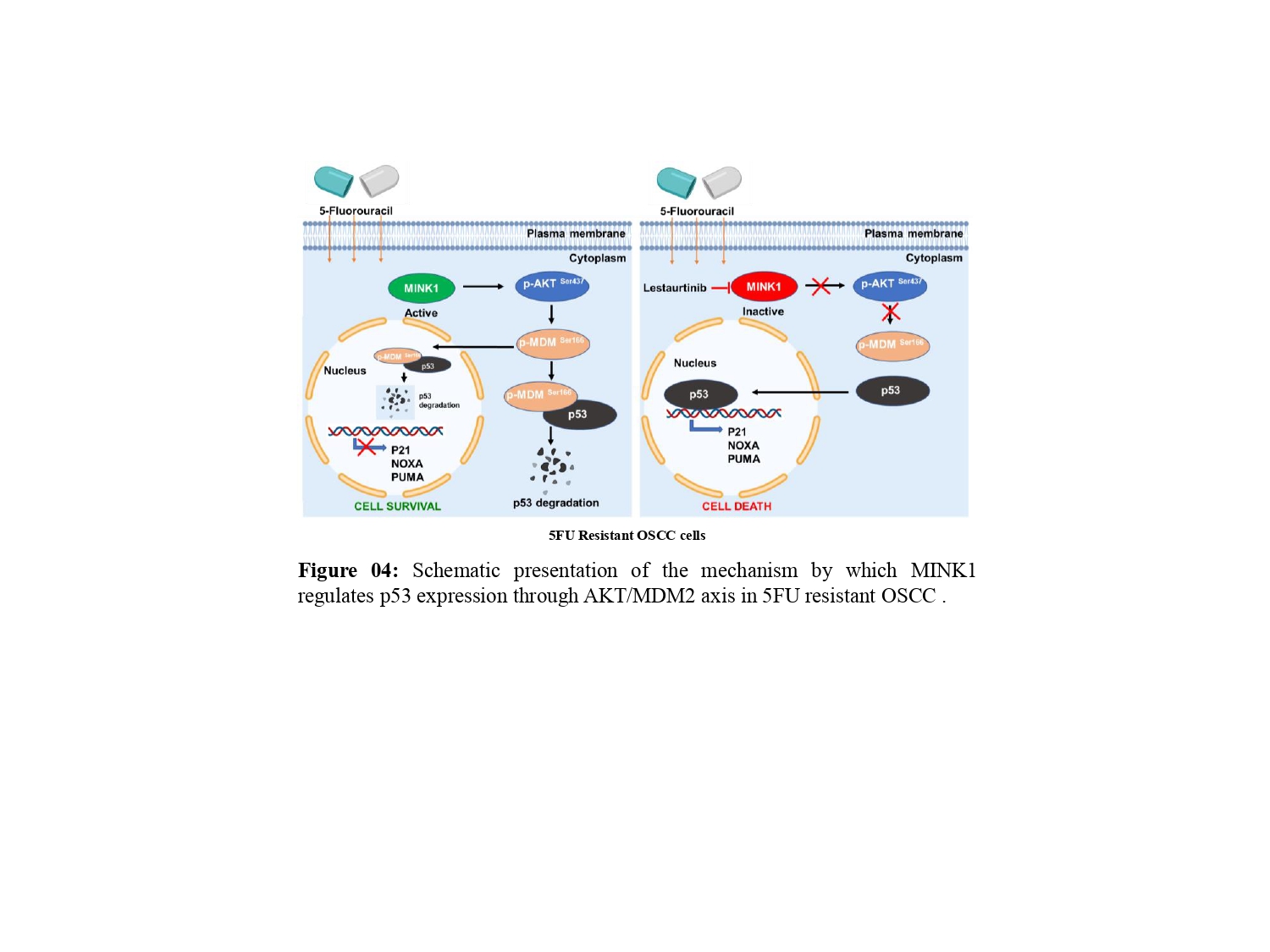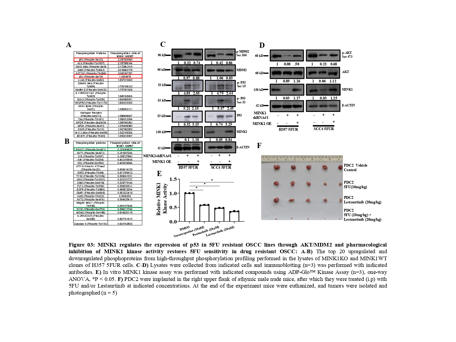 Though we have demonstrated that MINK1 negatively regulates P53 through AKT/MDM2 axis in 5FU resistant OSCC, the 5FU specificity of this MINK1 driven signalling cascade remains to be fully elucidated through future studies. In addition, the novel combination of MINK1 inhibitor lestaurtinib and 5FU needs further clinical investigation in advanced OSCC.