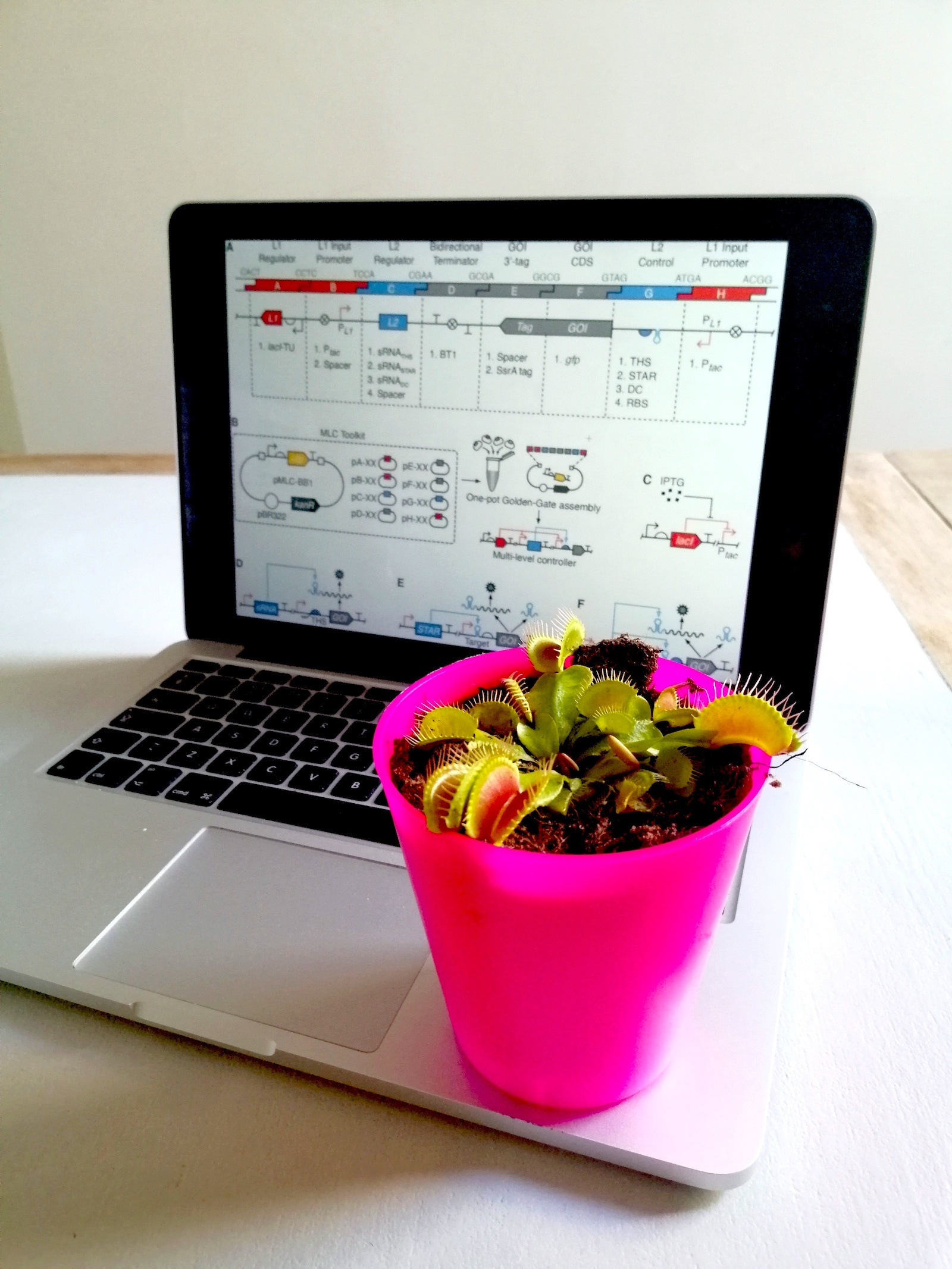 The two inducible promoters in our design are activated by the same input. Why would this be better than simply controlling the output gene with a single inducible promoter? The reason is that our more complex regulatory system implements what mathematicians call a coherent type-1 feedforward loop – a motif common in natural gene regulatory networks that is known to enable stringent control. For example, transcriptional noise could result in the accidental activation of a promoter. However, because the chance of this random event happening simultaneously for both promoters is tiny, the gene stays off – just like with the trigger hairs of the Venus flytrap!
