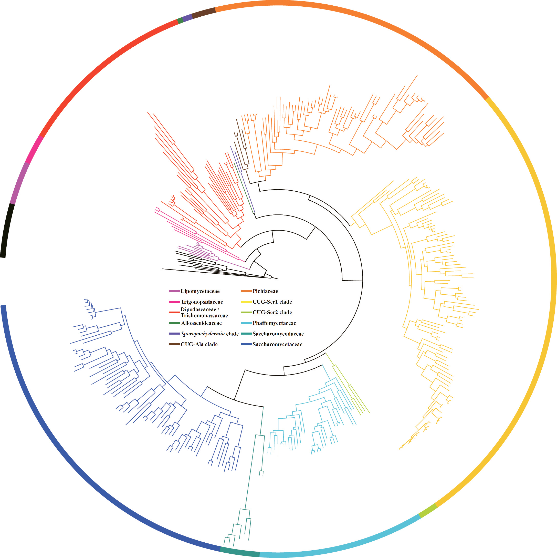 Although our new study's emphasis is on understanding the evolution of genes and traits involved in metabolism, one of the key achievements of our work is the generation of a genome-scale phylogeny and timetree that captures the diversity of budding yeasts (our analyses included genomes from 79 of the 92 recognized budding yeast genera!). Here's an image of it where species names have been removed and each lineage is shown with a different color (Ascoideaceae is part of the CUG-Ser2 clade in light green around the 5 hour mark):