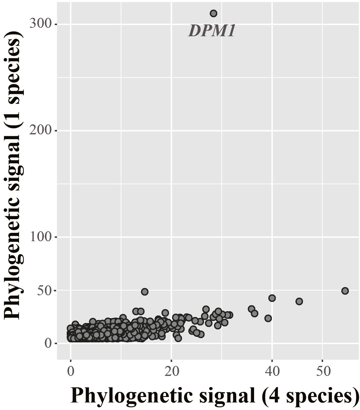 In contrast, removal of DPM1 from the data matrix and analysis of the remaining 1,232 genes yielded this topology: