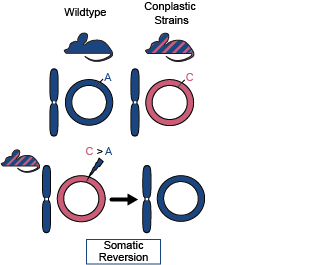 Fig. 3: Schematic of somatic reversion mutations. The wildtype strain (B6) has matching nuclear and mt-genome ancestries (B6 ancestry denoted in blue). Conplastic strains are hybrids with mismatching nuclear and mt-genome ancestry. Haplotype sites are positions in the mt-genome where the conplastic mt-genome differs from the B6 mt-genome. Somatic reversion mutations refer to the reintroduction of B6 ancestral alleles at haplotype sites.