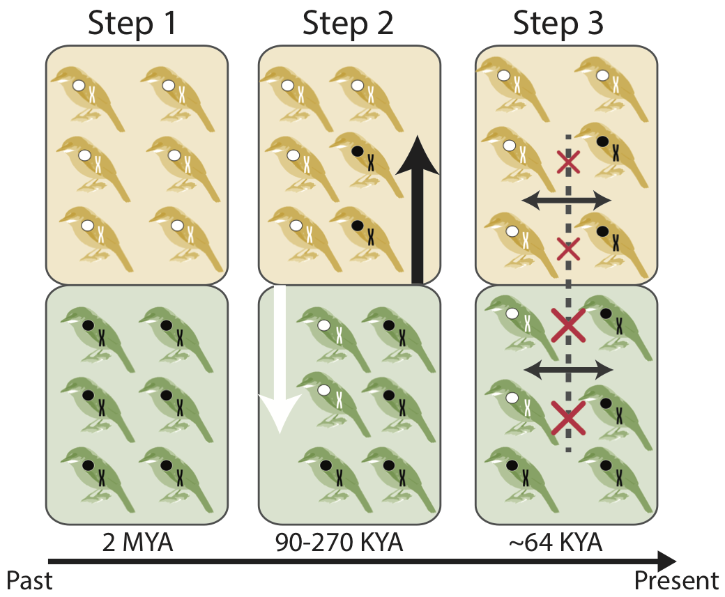 My PhD supervisors presented me with different study-systems to develop my project, and I was immediately attracted to the ‘weird’ EYR story. In the coming years, we sequenced mitochondrial genomes, random genomic sequences and analysed plumage colouration to explain the mitonuclear discordance (3-5) (Fig 1). We provided evidence that mitochondrial and nuclear genomes started to differentiate in a north-south direction ~2 million years ago. Later, ~90-270 thousand years ago, mitochondrial genomes seem to have swept adaptive mutations and introgressed bi-directionally, leading to the present day inland vs. coastal patterning of mitochondria and resulting in limited interbreeding between populations harbouring different mitochondrial lineages. Thus, it became clear that the north-south differentiation is a historical remnant, and that EYR is now evolving in an inland-coastal direction.