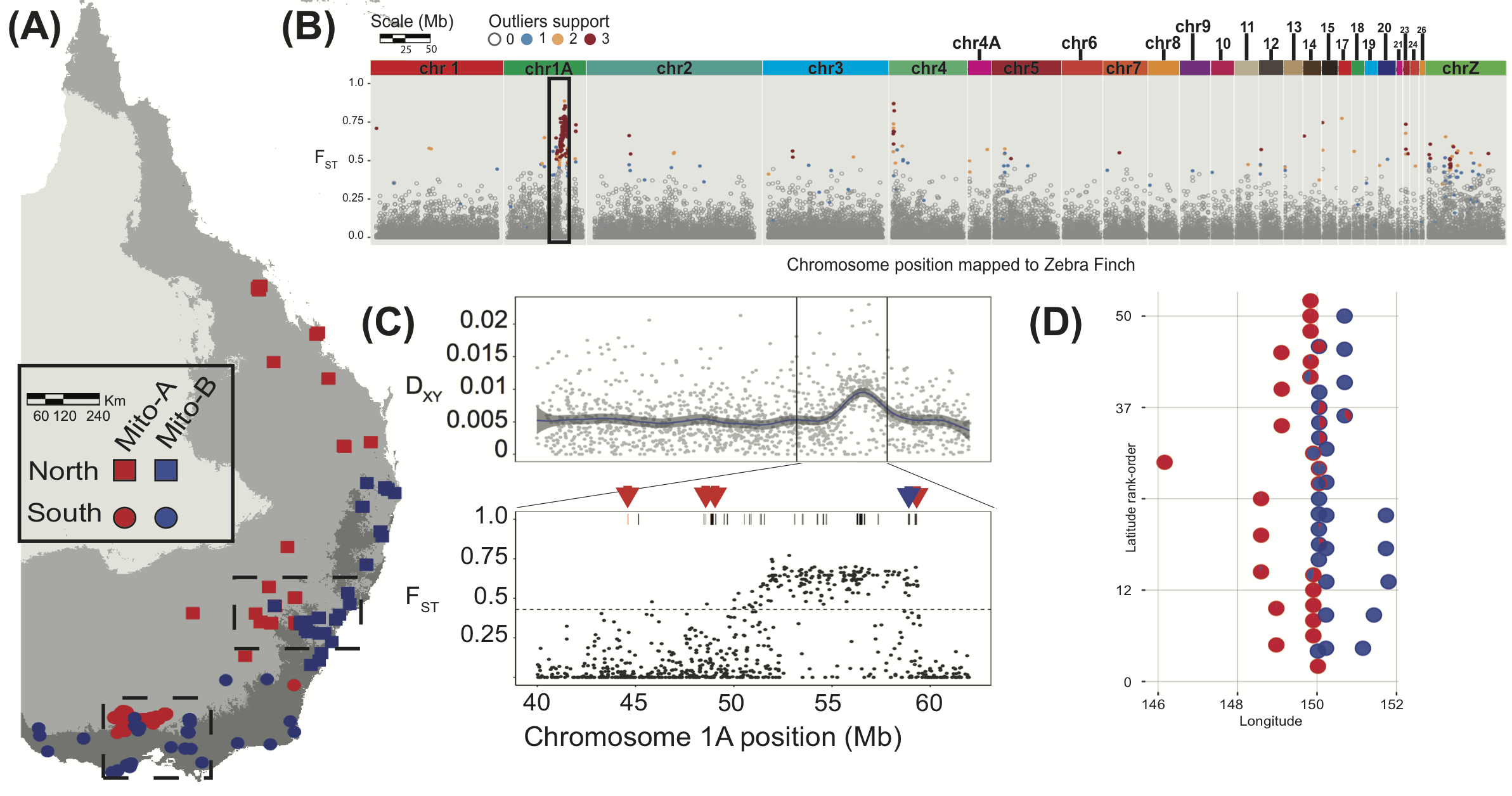 In the present paper, we aimed to understand how the nuclear genome evolves in cooperation with the mitochondrial genome. We screened nuclear genomes of EYR individuals located along two transects intersecting mitochondrial and climatic divergences. We found that substantial nuclear genetic differentiation between coastal and inland groups is restricted to a few genomic regions, notably a large segment of chromosome 1A enriched for genes whose products interact with those of the mitochondrial genome. Individuals with mismatched mitonuclear genotypes are found only within narrow contact zones, where the two groups meet and interbreed (Fig. 2). The mechanisms maintaining this genomic divergence are yet to be defined, but they are consistent with one or more of epistatic interactions, cold-spots of recombination and chromosomal rearrangements. Ongoing research focuses on expanding the genomic analyses and uncovering the functional consequences of mitonuclear co-evolution in EYR.