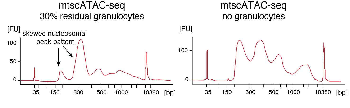 In our Nature Protocols publication, we now compiled our experiences of the past few years to describe the mtscATAC-seq method in detail, including different strategies to enrich your cells of interest via sorting as well as guidance to apply it to solid tissues, which has worked for example very well for us in human ovarian cancer. As neutrophils have Neutrophil Extracellular Traps (NETs) and a peculiar chromatin structure, we highly recommend excluding them via sorting, as they will skew your library distribution and negatively affect your data (Figure 4).