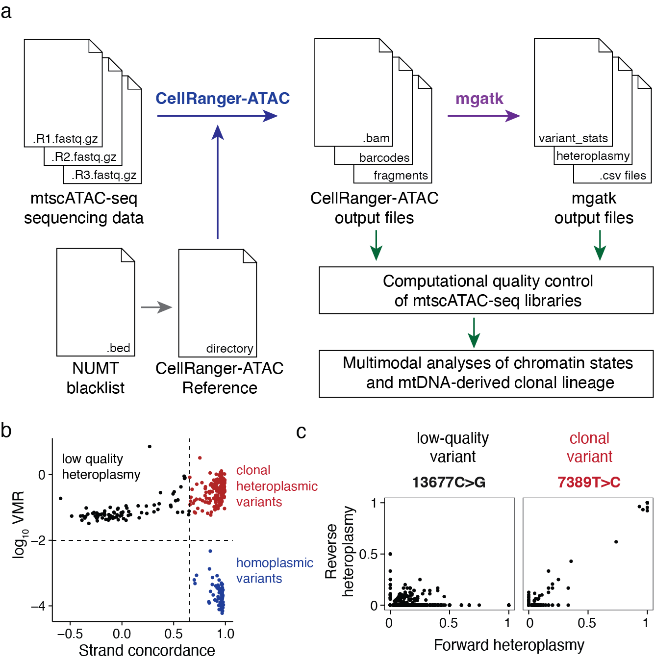 We also dive deeper into the integrated processing with 10x Cellranger-ATAC and our updated computational mgatk workflow for effective variant calling from mtDNA (Figure 5), including generating a custom reference genome, which is essential given the high homology of many regions in the mitochondrial genome with regions in the nuclear genome (NUMTs).