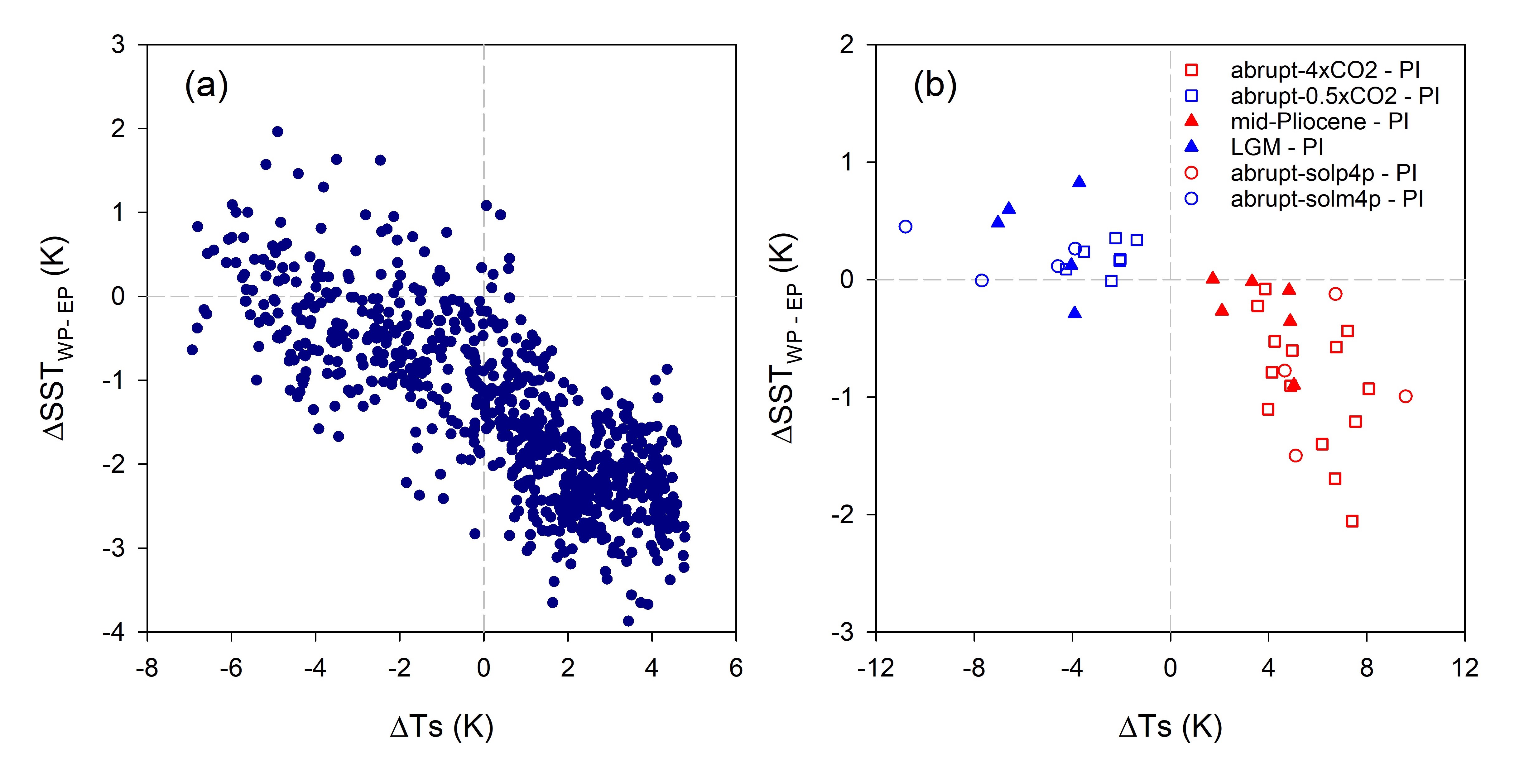 Despite a distinct global-mean warming resulting from increasing concentrations of greenhouse gases, substantial regional differences have been observed, especially over the satellite era. While the Northwest/Southwest Pacific and the Western Pacific warm pool show marked warming trends over the satellite era, the central-to-eastern equatorial Pacific exhibits weak cooling or muted warming trends in spite of greenhouse gas forcing (Fig. 1a). In contrast, a majority of current and earlier generations of climate models failed to reproduce this La Niña-like sea surface temperature (SST) trend pattern. This model-observation discrepancy appears to indicate systematic model deficiencies in simulating the tropical Pacific SST response to greenhouse gas forcing. However, due to potential roles of non-greenhouse gas forcing agents, such as Antarctic ozone depletion and anthropogenic aerosols, and internal climate variability in driving the observed La Niña-like SST trend pattern, it remains elusive to confidently determine the response of tropical Pacific SST to greenhouse gas forcing. In a new study, published in the journal Communications Earth & Environment, an international team of scientists from Republic of Korea and Japan shows that paleoclimate proxy records over the late Cenozoic support the model-projected weakening of the tropical Pacific zonal SST gradient under sustained strong global warming.