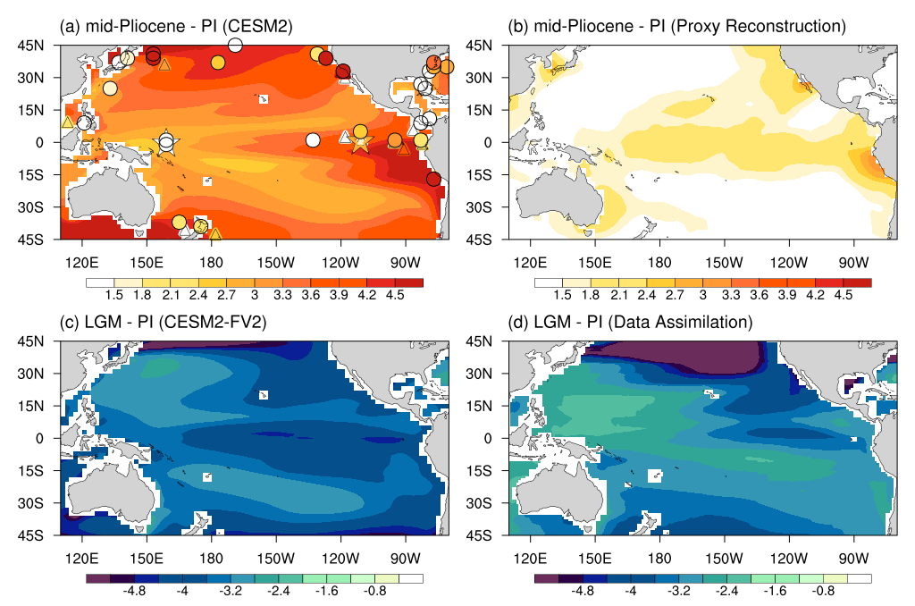 Due to this potential limitation of the effective duration over which high-quality historical SST observations exist, the research team led by Dr. Seong-Joong Kim, Vice President of Korea Polar Research Institute, attempted to determine the response of tropical Pacific SST to greenhouse gas forcing by analyzing paleoclimate proxy records over the past four million years. A variety of paleoclimate proxy records indicate that the tropical Pacific zonal SST gradient weakened during the mid-Pliocene warm period with high atmospheric CO2 concentrations (~400 ppm) relative to pre-industrial conditions (symbols in Fig. 2a and Fig. 2b), which is seemingly at odds with the La Niña-like SST trend pattern over the satellite era shown in Fig. 1a. The reduced zonal SST gradient during the mid-Pliocene warm period conversely implies an enhanced zonal SST gradient during colder climates with lower CO2 levels. Based on the fact that the Last Glacial Maximum (LGM) was characterized by a much colder climate with much lower CO2 levels (~200 ppm), the research team also analyzed paleoclimate proxy records during the LGM period. The LGM SST anomalies relative to pre-industrial period inferred from geochemical proxy records, however, exhibit an indistinct change in the zonal SST gradient, probably due to large uncertainties stemming from incomplete and uneven proxy data sampling in both space and time. To avoid large uncertainties in paleoclimate proxy records during the LGM, they also analyzed paleoclimate data assimilation products, in which large uncertainties arising from incomplete and uneven proxy data sampling were substantially reduced, and found enhanced cooling over the eastern equatorial Pacific than over the western equatorial Pacific (Fig. 2d). Climate model simulations are found to broadly reproduce this contrasting feature between the mid-Pliocene (Fig. 2a, shading) and LGM (Fig. 2c). In addition, paleoclimate proxy records over the late Cenozoic period indicate that an overall increase of the zonal SST gradient over time has been accompanied by global-mean cooling associated with decreasing concentrations of CO2 (Fig. 3a), which idealized climate model simulations are found to qualitatively reproduce (Fig. 3b). These results therefore collectively suggest that the zonal SST gradient is likely to weaken under sustained strong greenhouse gas forcing. The research team, however, acknowledges that further study is needed as substantial uncertainties remain in paleoclimate proxy records due to uneven proxy data sampling, proxy uncertainties and methodological limitations.