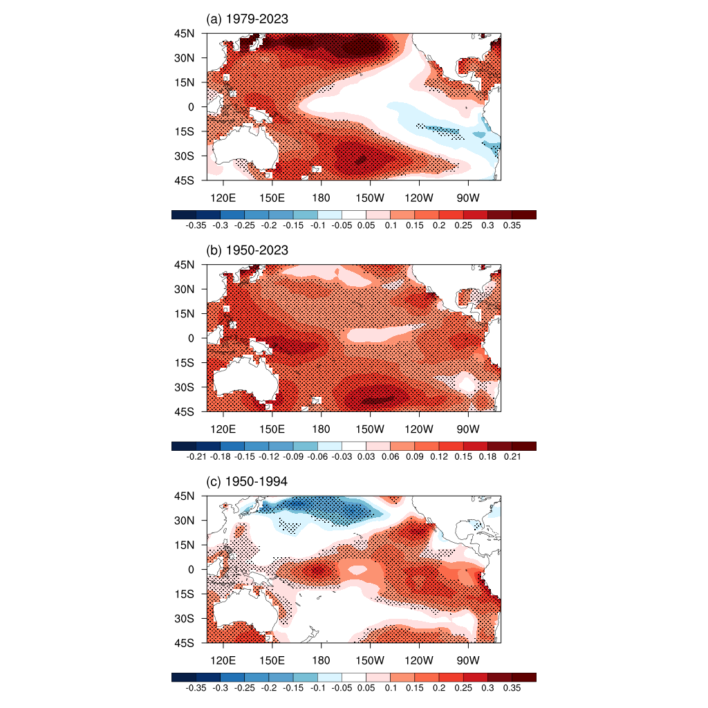 In case that the La Niña-like SST trend pattern over the satellite era is a forced response to greenhouse gas forcing, one would expect that more pronounced spatial patterns with enhanced zonal asymmetry have emerged over an extended historical period. However, the SST trend pattern over a post-war period (i.e., 1950–2023; Fig. 1b) is noticeably different from that over the satellite era (i.e., 1979–2023; Fig. 1a). In addition, despite a similar steady rise in greenhouse gas concentrations, an El Niño-like, rather than La Niña-like, SST trend pattern was observed over the period 1950–1994 (Fig. 1c). This dependence of tropical Pacific SST trend on analysis period suggests the roles of non-greenhouse gas forcing agents and/or internal climate variability. As a result, it is uncertain whether the La Niña-like SST trend pattern over the satellite era can be attributed solely to greenhouse gas forcing.