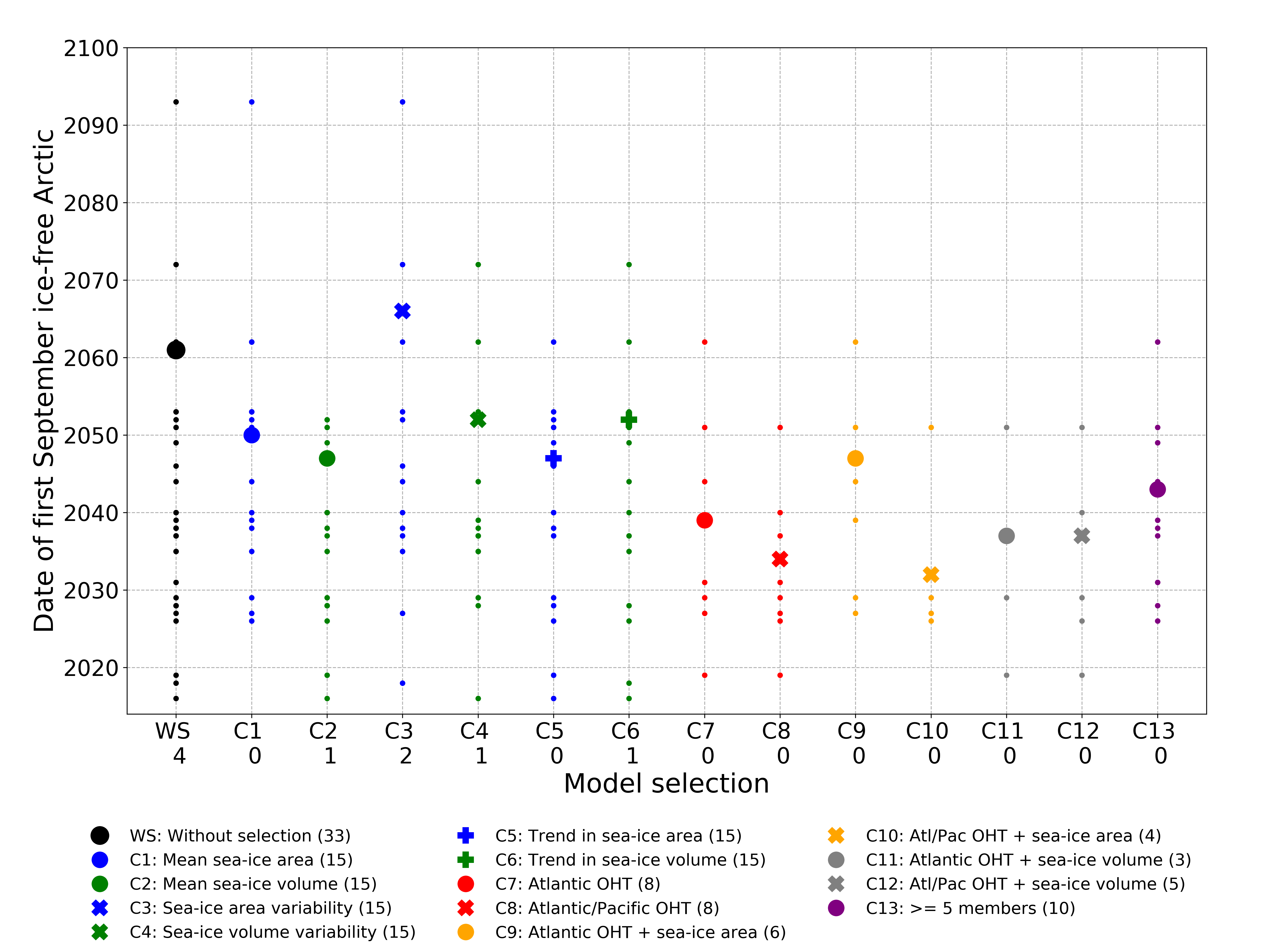 Then, we selected the climate models closest to observations over the recent past (1979-2014) using different criteria based on sea-ice area, sea-ice volume and ocean heat transport, as we know the latter affects changes in sea ice. Using this methodology, we found that the Arctic could be almost ice free around 2035 using model selection based on ocean heat transport (combined or not with sea-ice area and volume), and around 2050 using selection based on sea-ice area and volume only, in the high-emission scenario, thus some 26 years and 15 years earlier than without model selection (see figure below).