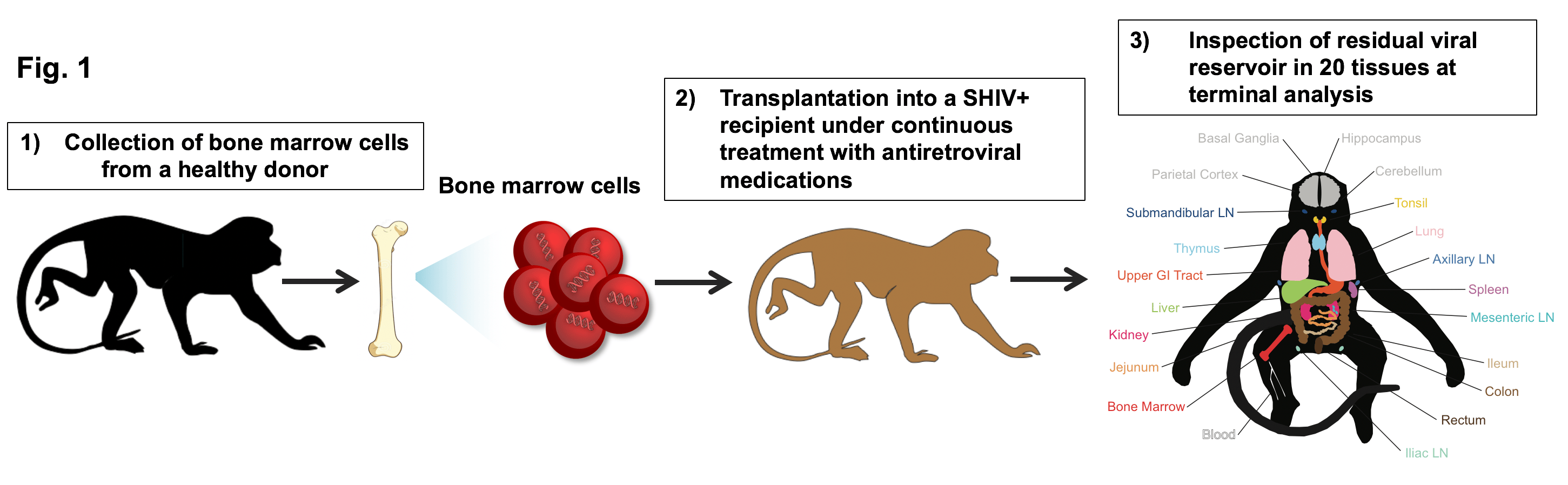 To address this need, our group developed the first allogeneic bone marrow transplantation model in non-human primates that were infected with an HIV-like virus (Simian-Human Immunodeficiency Virus, SHIV), and suppressed with antiretroviral (ART) medications. We transplanted bone marrow isolated from healthy donors into 3 SHIV-infected, ART-suppressed recipients (Fig. 1) and then rigorously analyzed 20 tissues isolated from the animals at their post-transplant terminal analysis.