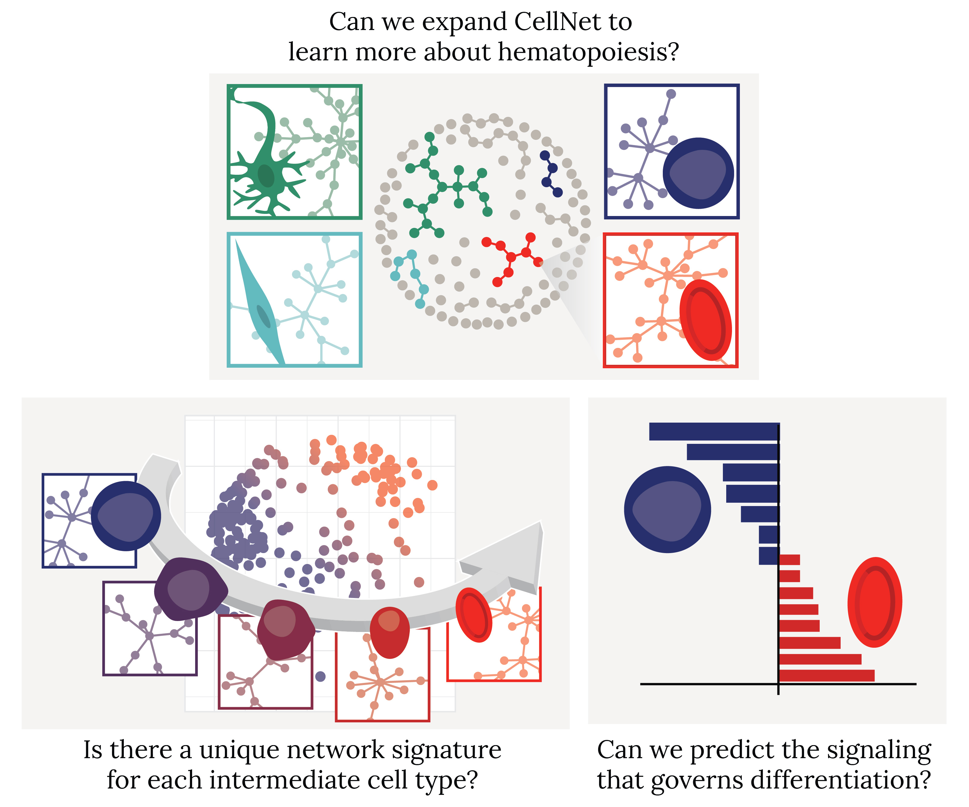 Next, narrowing in on the single lineage of erythropoiesis, we asked: is there a unique gene regulatory network signature corresponding to each intermediate cell type? This is where the biology forced us to depart from CellNet; we found that we could not simply reuse the same machine learning approaches to further parse out the stages of differentiation. Our attempts taught us that there were no mutually exclusive, isolated gene networks demarcating individual cell states. In evaluating new approaches, we turned to the systems biology expertise of the Lauffenburger lab at MIT. Inspired by recent innovations in single cell genomics, we used dimensionality reduction to view differentiation as a trajectory along a continuum. When combined with the additional layer of network biology information from CellNet, our new computational framework allowed us to analyze how networks were turned on and off and rewired during differentiation. This gave us a revealing snapshot of WHAT the network architecture looked like over time.