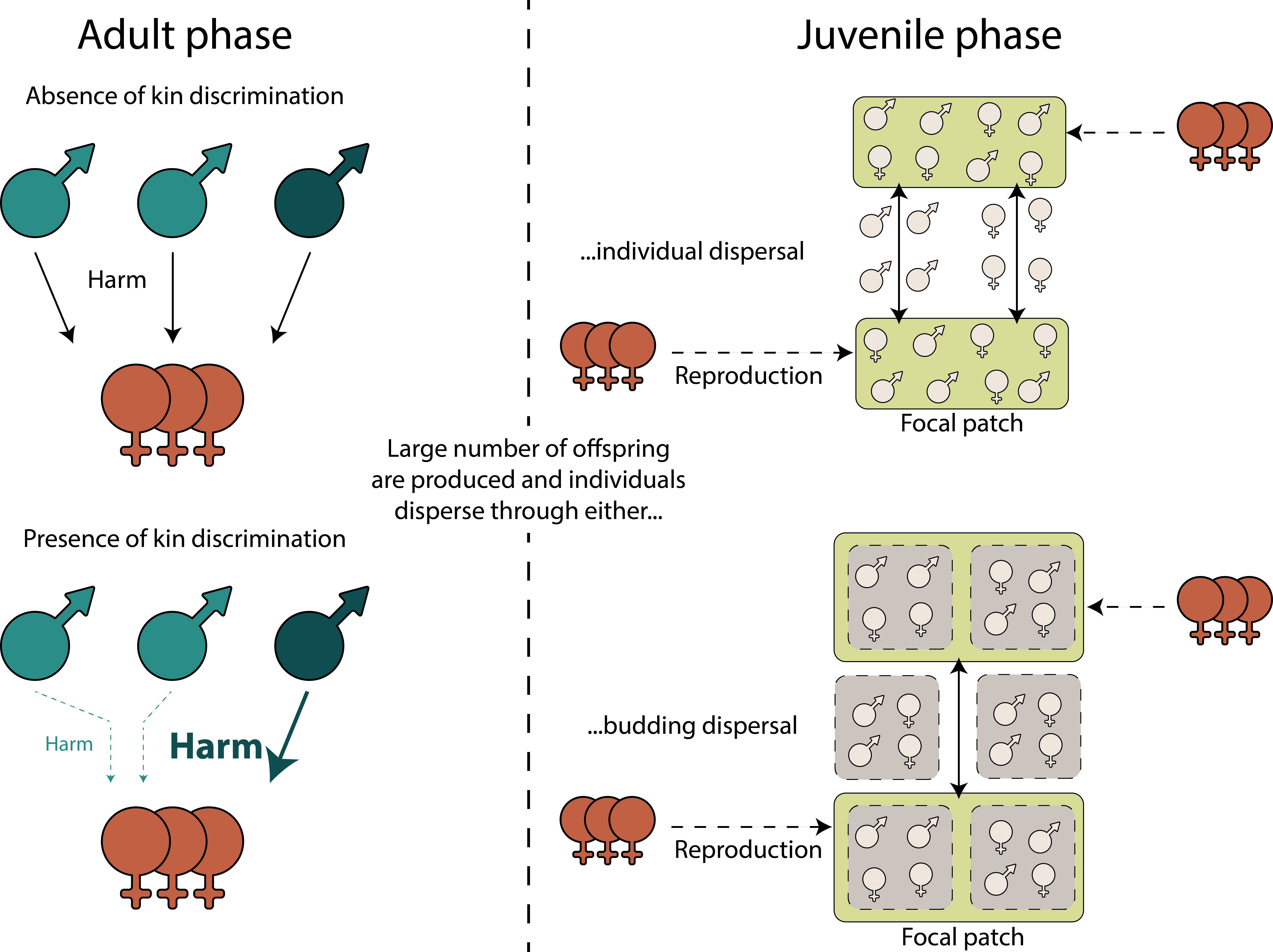 The idea behind this paper was to plug these gaps in the literature and, at the same time, synthesize all the work – both theoretical and empirical – that has been done on kin selection and sexual conflict. We do this through the use of mathematical models. Broadly speaking, we addressed the role of two factors that can shape sexual conflict – relatedness and scale of competition. We found that kin discrimination and competition between groups for resources are two mechanisms that can disentangle the two, allowing both relatedness and the scale of competition to vary independently. Moreover, we also found that, when both kin discrimination and limited dispersal are present, limited dispersal does not generally work to reduce the male harm in the population. Instead, it tends to increase male harm due to the fact that limited dispersal also increases local competition. The drawback of kin discrimination is that, while it allows for a more direct measure of relatedness between an individual and its social partners, it seemingly increases the average harm in the population when compared to a scenario in which kin discrimination is absent.