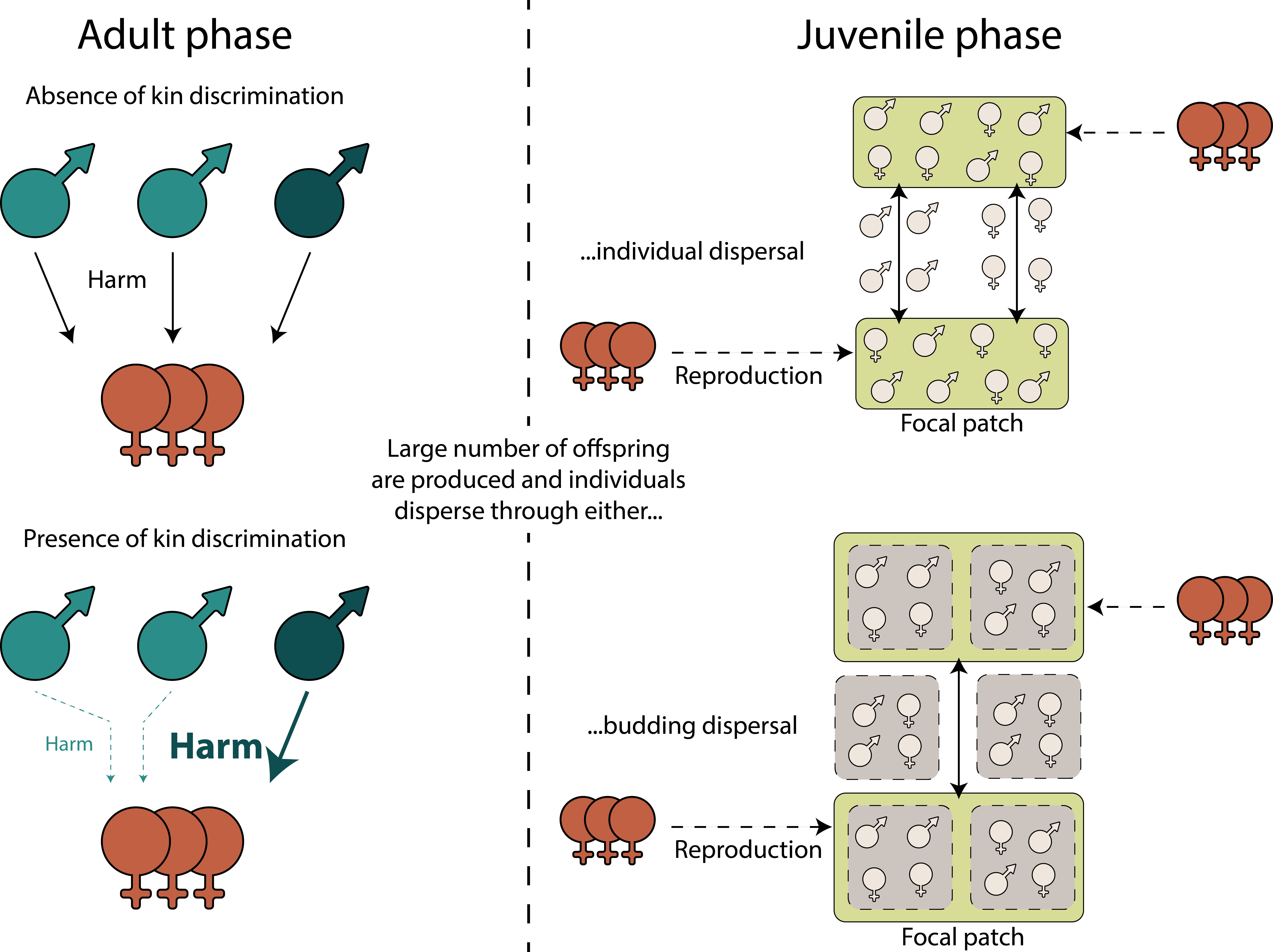 The idea behind this paper was to plug these gaps in the literature and, at the same time, synthesize all the work – both theoretical and empirical – that has been done on kin selection and sexual conflict. We do this through the use of mathematical models. Broadly speaking, we addressed the role of two factors that can shape sexual conflict – relatedness and scale of competition. We found that kin discrimination and competition between groups for resources are two mechanisms that can disentangle the two, allowing both relatedness and the scale of competition to vary independently. Moreover, we also found that, when both kin discrimination and limited dispersal are present, limited dispersal does not generally work to reduce the male harm in the population. Instead, it tends to increase male harm due to the fact that limited dispersal also increases local competition. The drawback of kin discrimination is that, while it allows for a more direct measure of relatedness between an individual and its social partners, it seemingly increases the average harm in the population when compared to a scenario in which kin discrimination is absent.