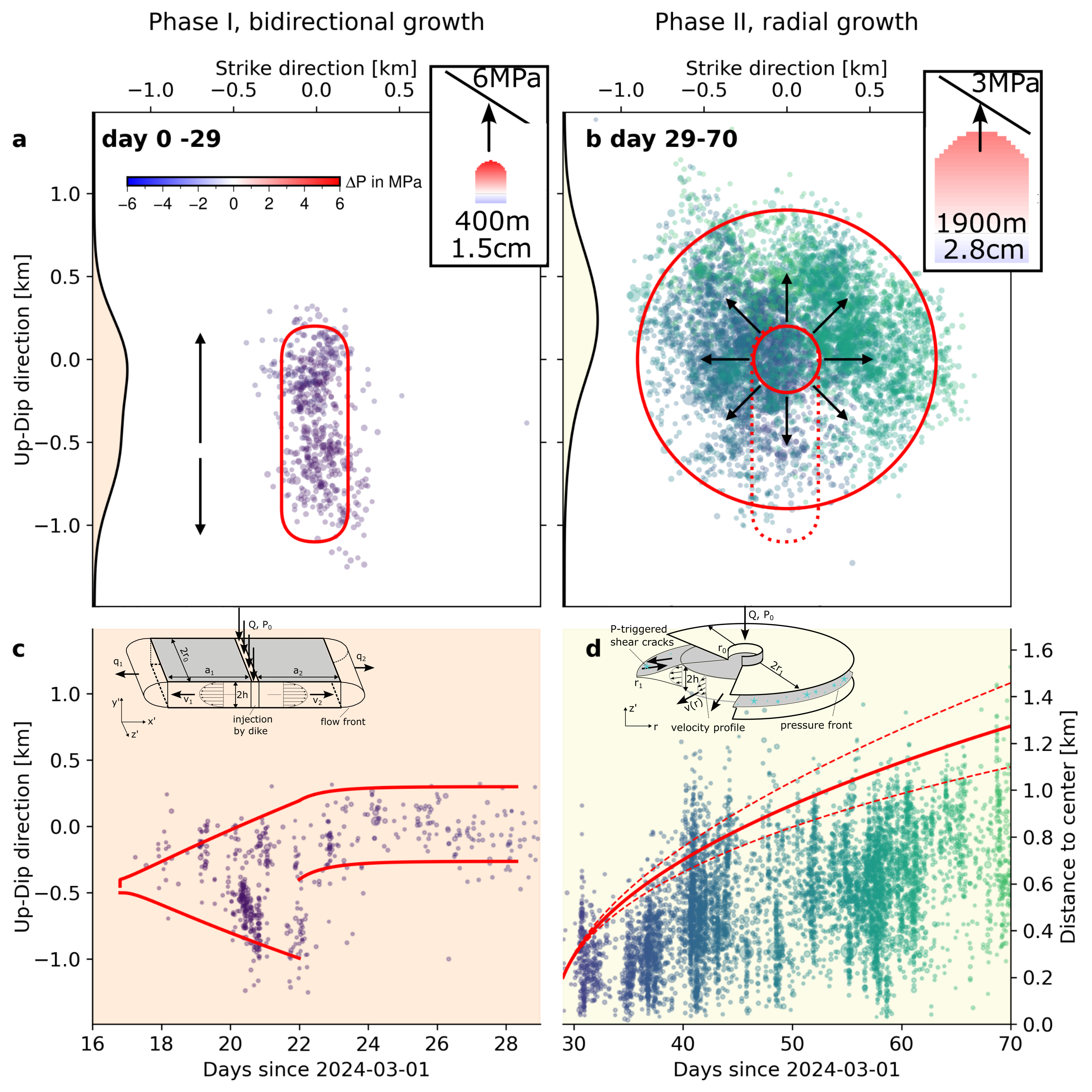 Phase I (left) shows bidirectional crack propagation driven by a small, buoyant fluid batch with high overpressure. Phase II (right) reflects radial widening caused by a larger, denser batch with lower overpressure. The sketches in the center illustrate the simplified theoretical models used to represent the two fluid intrusions, while the red curves show the predicted growth patterns that closely match the spreading of seismicity.