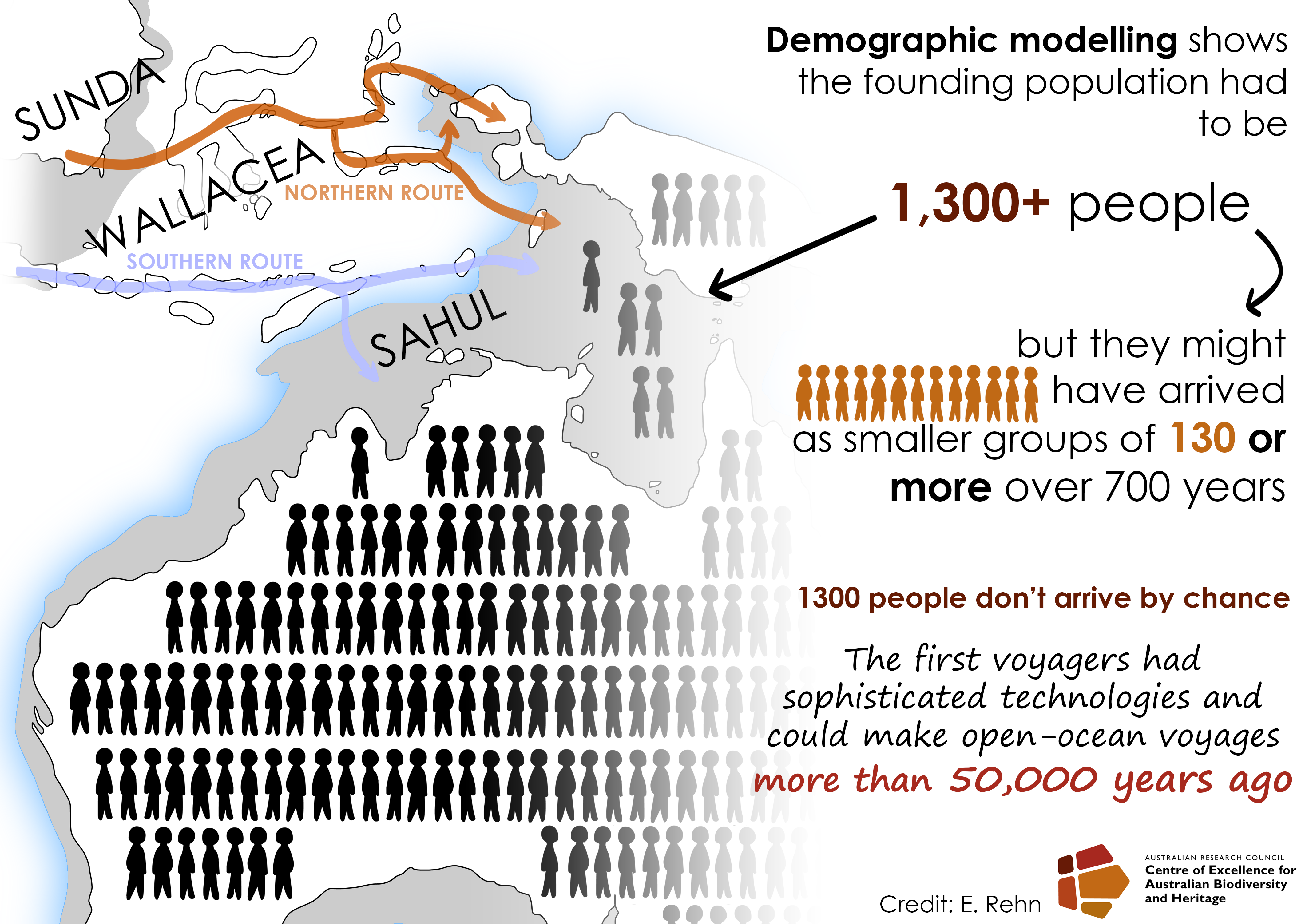 Our simulations indicate that at least 1,300 people likely arrived in a single migration event to Sahul, regardless of the route taken. Any fewer than that, and they probably would not have survived, for the same reasons that it is unlikely that an endangered species can recover from only a few remaining individuals.