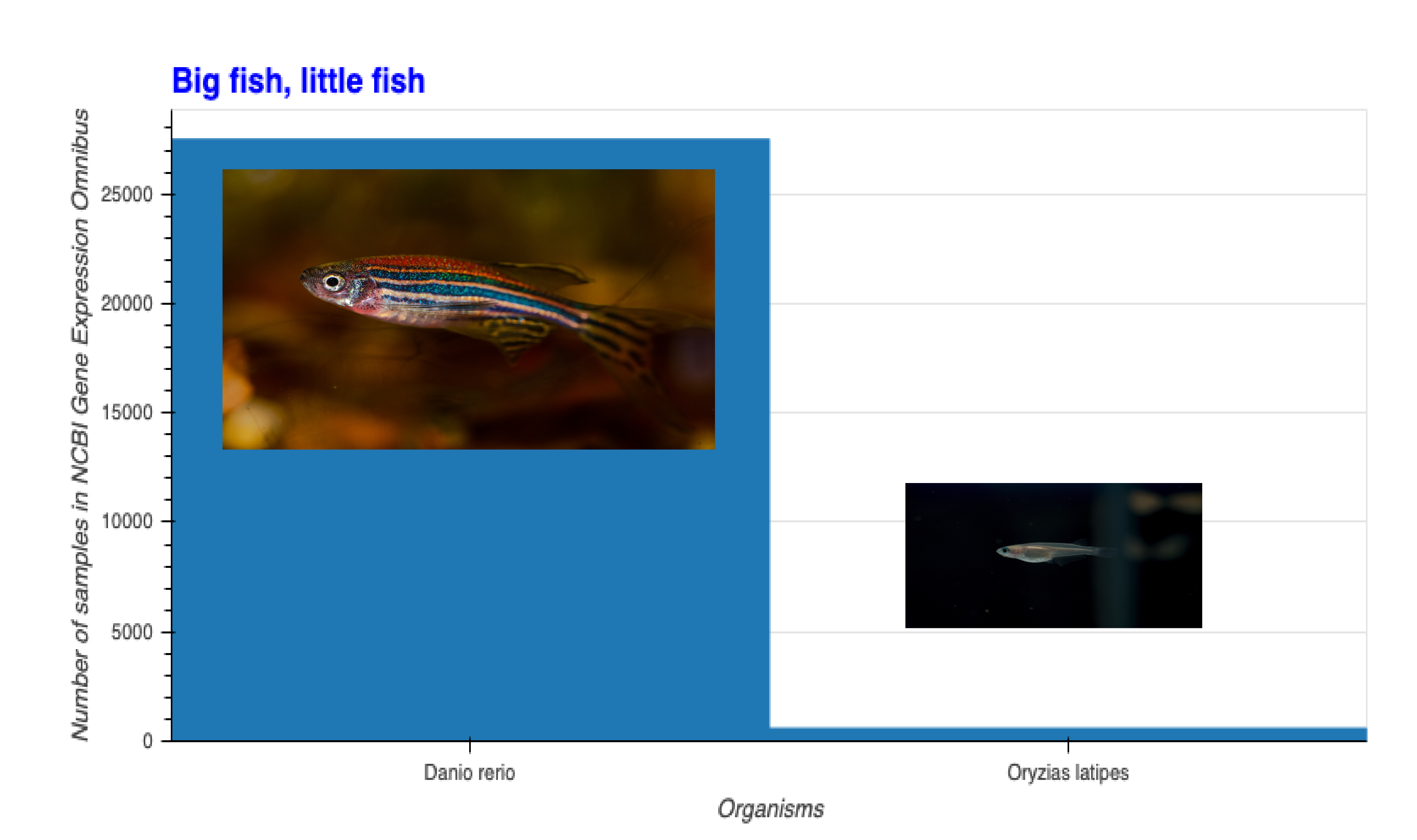 For the research organism that Tu mainly studies medaka--Oryzias latipes--the NCBI's GEO holdings offer information about 584 samples. For, the zebrafish--Danio rerio--there are 27,481 samples.