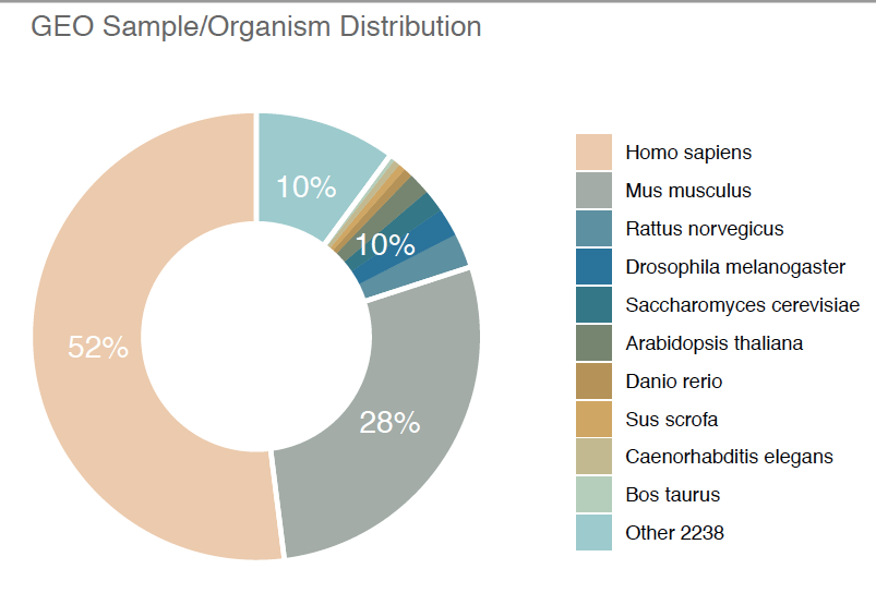 GEO presents a tally of sample numbers for the organisms, which refers to data sets such as DNA and RNA data. Some organisms are mentioned for which there are fewer than 10 samples available in GEO, so Tu removed those from a quick analysis. That leaves 2,248 organism.