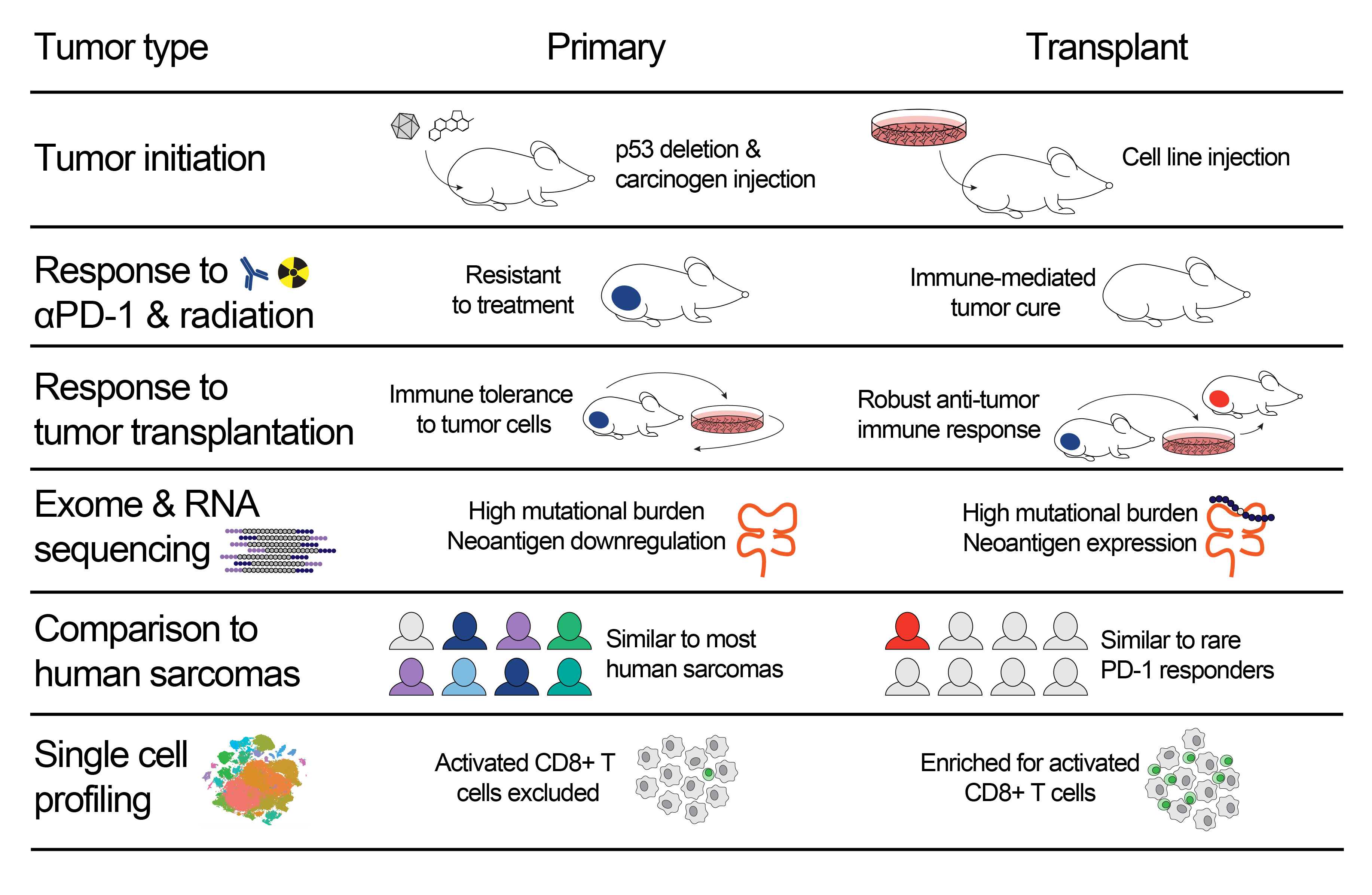Next, we compared the immune profile of murine and human sarcomas. We found that the immune landscape of primary mouse sarcomas, which do not respond to immunotherapy and radiation therapy, is similar to that of most human sarcomas. In contrast, transplant sarcomas, which are cured by immunotherapy and radiation therapy, resemble only a subset of highly inflamed human sarcomas that responded to anti-PD-1 therapy7.