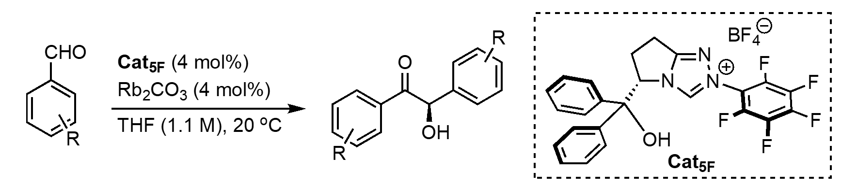 As a new group, we started building up our lab in October 2015. I was the first graduate student in the lab together with one postdoc, Dhayalan Vasudevan. In addition to setting up the lab, we had an idea that we wanted to test, which later evolved to become this project. Based on the assumption that the activity of organocatalysts is affected by perturbations to the catalyst structure, we thought that by binding molecular modifiers to an organocatalyst during the reaction we might tune its activity. We hoped that this concept would be of benefit to the asymmetric organic synthesis field as this strategy involves less synthetic effort to prepare diverse catalyst structures. In addition, enhancing catalyst libraries in this manner would perhaps extend the potential substrate scope of a reaction. Beyond these general advantages, our research group is interested in applying statistical methods to understand and optimize reactions, therefore, having access to larger catalyst libraries was a particularly important aim for us. We targeted boronic acids (BAs) to be candidates as molecular modifiers due to their abundance and wide use in organic chemistry, also, BAs would bind to hydroxy groups on catalysts which will enable us to tune the activity of the catalyst. As proof of concept, we surveyed the literature for an organocatalytic system in which the catalyst has a hydroxy group near the active site and was thought to involve hydrogen bonding to control the selectivity. We found that Connon, Zeitler and coworkers had reported an N-heterocyclic carbene (See figure 1, Cat5F) that catalyzed benzoin condensations and fit the above requirements.1