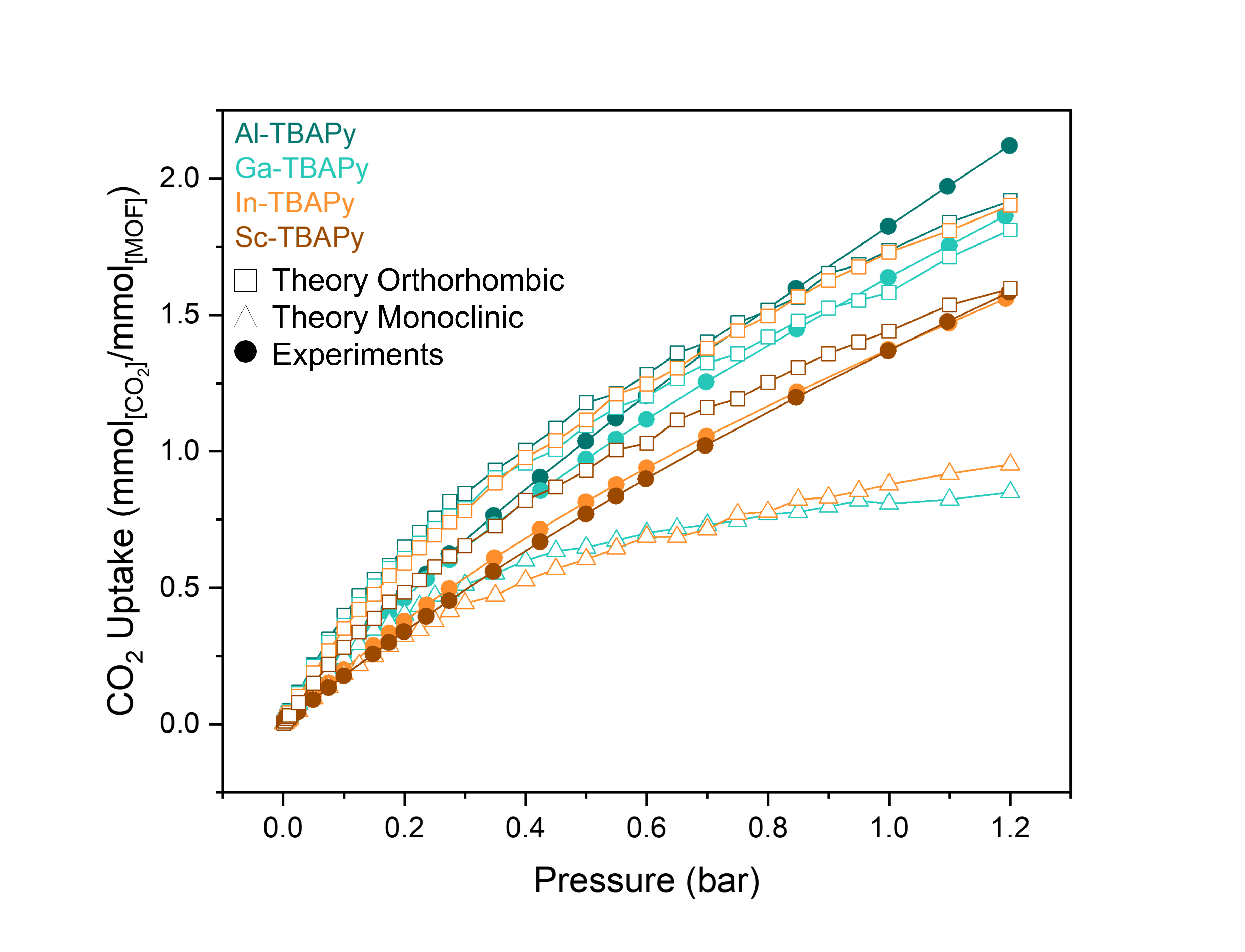 Integrated lab and computer experiments were also performed. In that regard, we developed four computational models for the orthorhombic structures and two monoclinic models for the In- and Ga-TBAPy structures. Computational CO2 adsorption isotherms show that the monoclinic structures saturate at much lower pressures than the orthorhombic structures, possibly due to their much lower pore volume. Experimentally, in the low-pressure regime, the uptakes match more closely to the uptakes of the simulated monoclinic structures. At the same time, at higher pressure, they follow more closely the orthorhombic ones, which may suggest structural rearrangements upon CO2 loading (Figure 2).