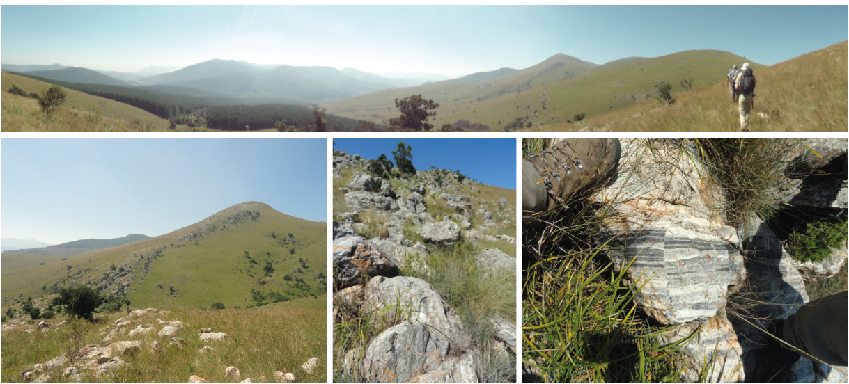 Figure 1: Panorama of the Barberton Makhonjwa Mountains, recently inscribed on the UNESCO World Heritage List, and photos of the sedimentary rocks of the Buck Reef Chert, composed of alternating light and dark bands. Photos by Nicolas Olivier.