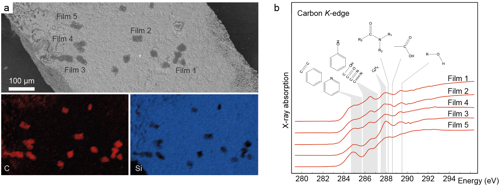 Figure 2: (a) Backscattered electron image obtained by scanning electron microscopy, and corresponding maps constructed from energy dispersive X-ray spectroscopy data showing the distribution of carbon (red) and silicon (blue). (b) X-ray absorption spectra at the carbon K-edge obtained using synchrotron-based X-ray absorption microspectroscopy, showing the functional groups present in the films studied. Figures from the publication.