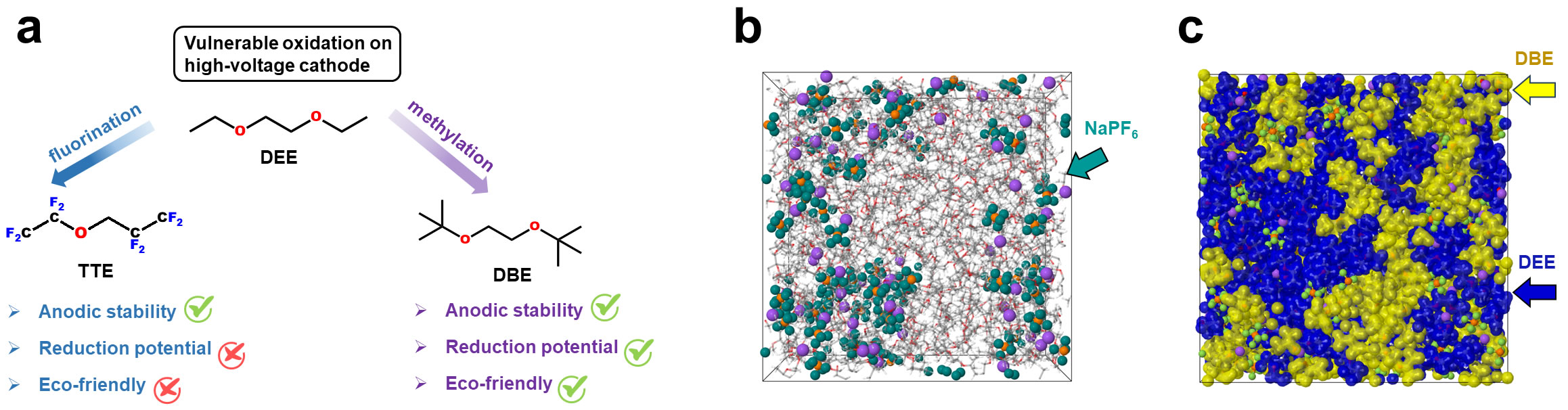 Figure 1. Electrolyte design strategy and solvation. (a) The electrolyte design route and principle, with key properties of the solvents highlighted under the molecule. b-c, MD simulation snapshots highlighting NaPF6 as cyan isosurfaces (b) and nano-domain formation for DEE/Na+ as blue isosurface and DBE as yellow isosurface for DEBE (c).