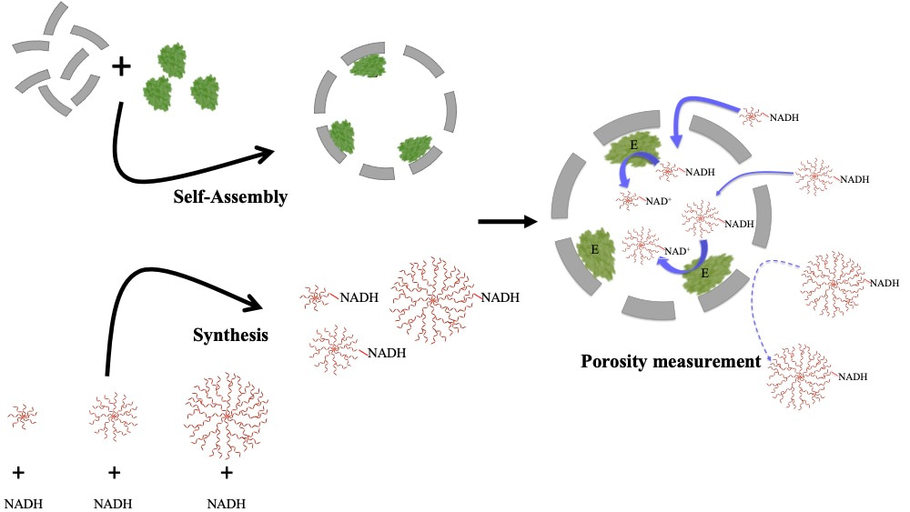 Figure 1: Scheme of our experiments: P22 particles self-assembled with coat protein (CP) and scaffold protein (SP) -enzyme fusion (AdhD-SP). NADH was synthesized to yield NADH-dendrimer conjugates. The porosity of P22 particles was probed by using the various NADH-dendrimer molecules as bait for the AdhD enzyme. If the “bait” accessed the interior of the particle, we saw the redox reaction (NADH-->NAD+).