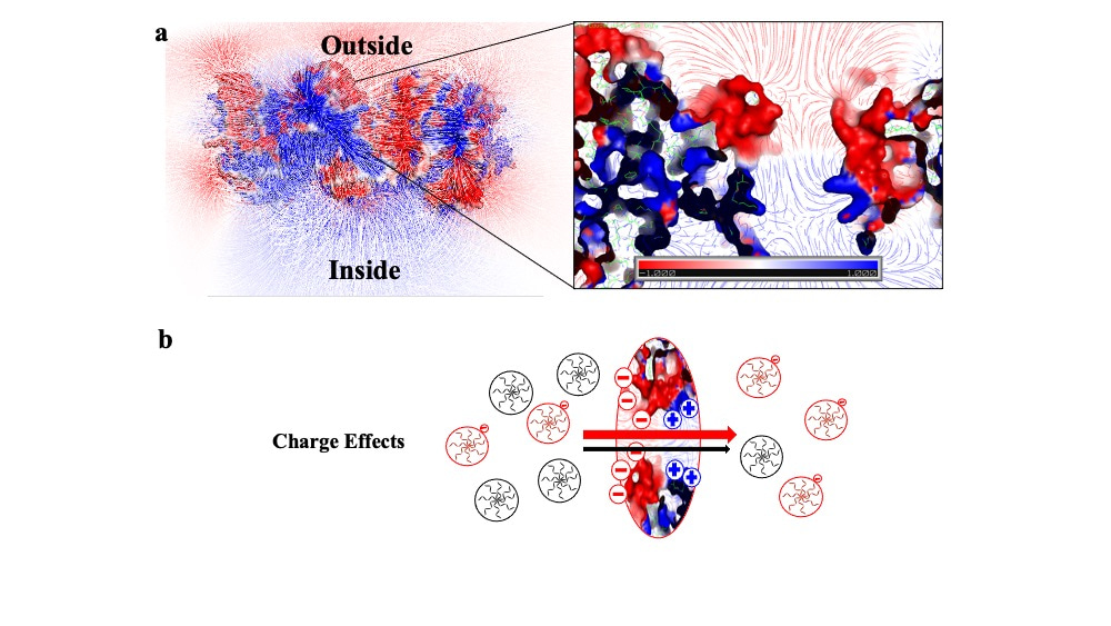 One of the most surprising findings was that negative substrates traversed across the negatively charged P22 VLPs more readily than neutral substrates, sending us down an investigative path into the electrostatic effects of both the virus particles and the synthesized substrates. Since the zeta potential of P22 VLPs is about -30 mV, our initial hypothesis was that electrostatic repulsion would affect the negative substrates, and their translocation across the pores would be inhibited. Since our experimental results suggested otherwise, we generated an electrostatic map of the P22 asymmetric unit that revealed a complex distribution of charges around the pore, with negative charges lining the exterior regions and positive charges lining the interior (Figure 2a), resulting in an electrostatic gradient from outside to inside. The electric field lines provided the likely path that charged substrates might take when entering the electrostatic field, leading us to hypothesize that negative substrates encounter the gradient and are effectively driven inside. To explore this phenomenon, we designed two different mutants of P22 in which the charge distribution was altered by several point mutations. The results showed that removing the positive charges lining the interior pore (and disrupting the gradient) leads to a significant decrease in the ability of negative substrates to access the interior of the capsid. In this mutant, the negative and neutral substrates access the interior to the same extent.