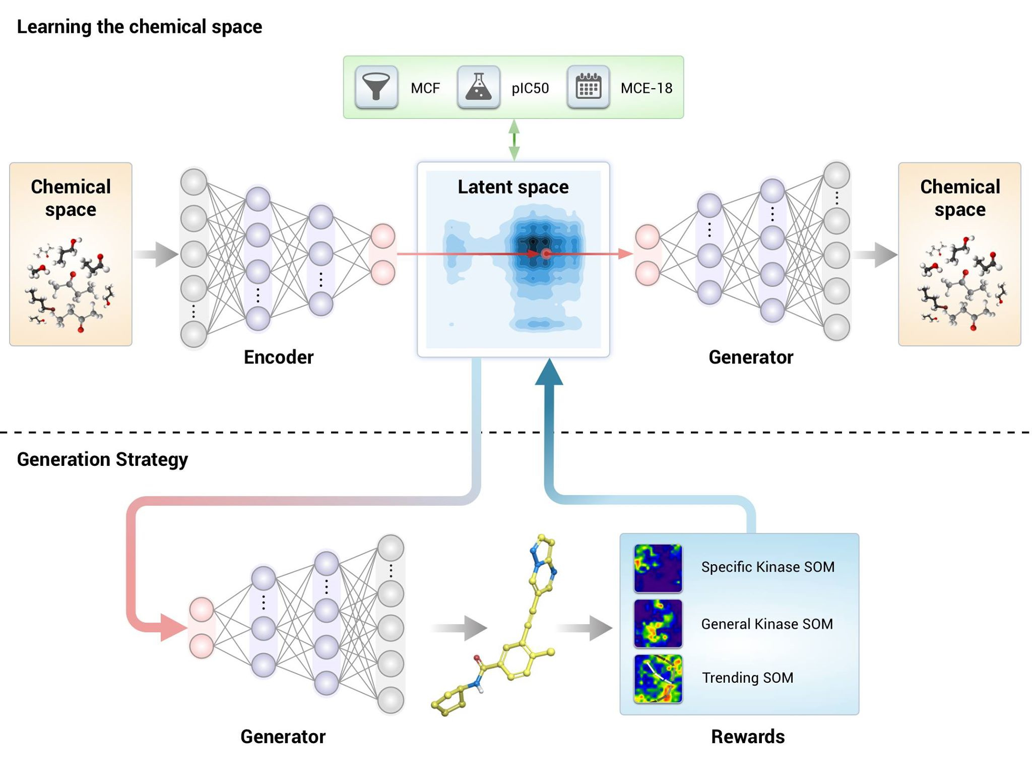 Figure 3: The basic graphical representation of GENTRL approach. It generates the molecules with specific conditions and learns to generate molecules with the specific objectives.