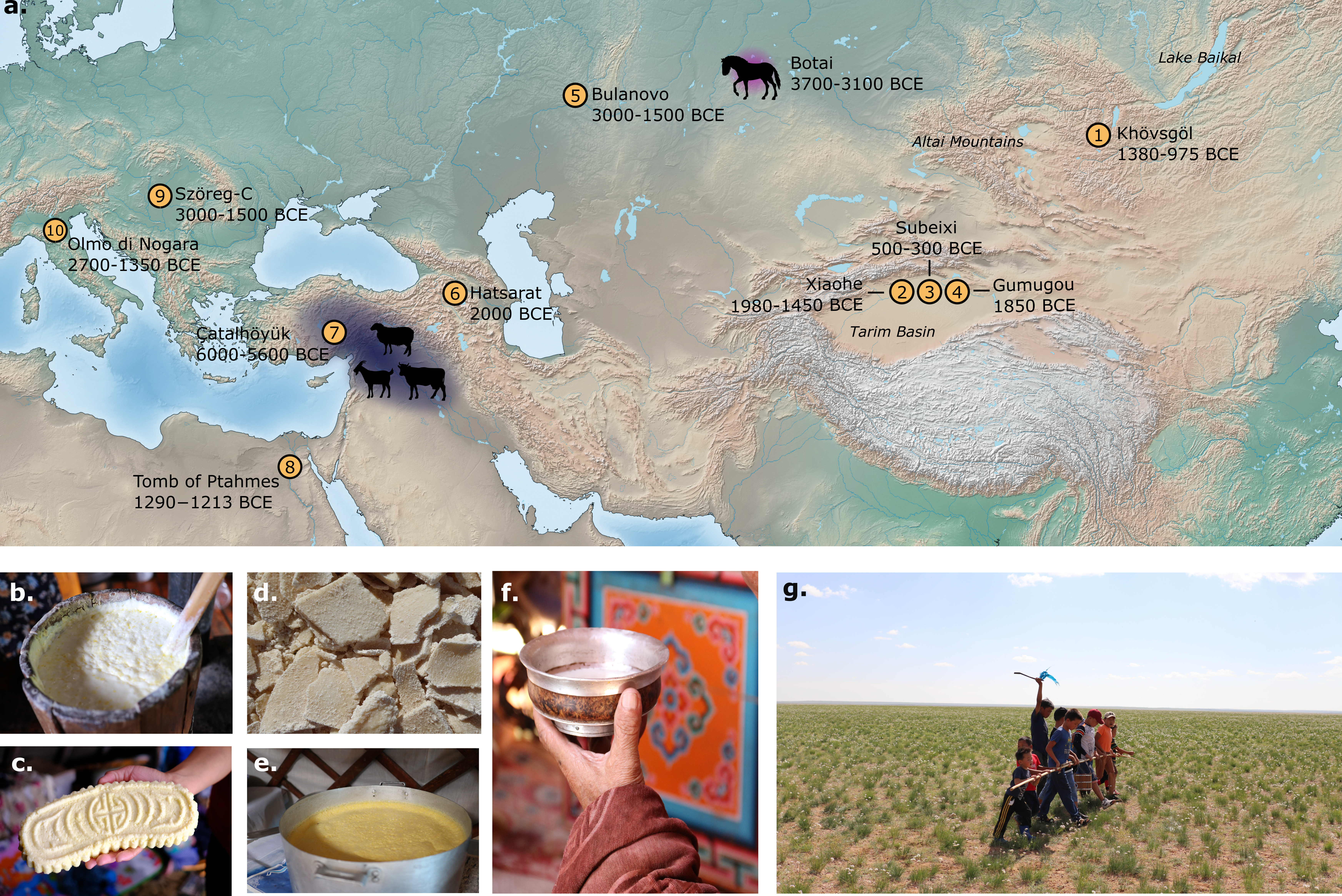 Балар эртний үеийн хүмүүсийн хоол тэжээлд гарсан нэгэн том өөрчлөлт бол хүүхэд том болж, эхийн сүүнээс гарсан ч гэсэн малын сүүг хүнсэндээ хэрэглэж эхлэх болсон явдал байв5. Баруун Евразийн тал нутгийн нүүдэлчдийн судалгаанд биомолекулийн судалгааны аргыг ашиглан дээрх үйл явцыг судлан шинжлэх аргыг өргөнөөр ашиглаж ирсэн. Баруун өмнөд Азид үхэр (Bos taurus), хонь (Ovis aries), ямаа (Capra hircus)-г анх гаршуулж эхэлсэн бөгөөд дараа нь зүүн зүг рүү Евразийн талыг дамжин, Төв Ази руу тархсан хэмээн үздэг6. Неолитикийн үеийн Анатоли болон зүүн Европоос8, мөн зэс, хүрэл зэвсгийн үед хамаарах Казакстанаас9,10 олдсон шавар сав суулгануудаас сүү, цагаан идээний липид (тос)–ийн биомолекулууд олдсон нотолгоонууд нь цагаан идээний соёл Баруун өмнөд Азид анх үүсэж тархсан байж болзошгүйг харуулж байна. Баруун хойд Хятад дахь Шинжаан мужийн зүүн хэсгийн Тамир Базинаас олдсон хүрлийн дунд үед хамаарах нэхмэл тэвшнээс11 сүүний уургийн ул мөр болон маш сайн хадгалагдан үлдсэн тараг, бяслагны үлдэгдэл хэсэг12зэрэг цагаан идээний үлдэгдлүүд олдсон юм (Зураг. 1). Хөвсгөл аймгийн хойд хэсгийн хэд хэдэн газарт саяхан хийсэн археологийн нэгэн малтлага, судалгааны үр дүнд илрүүлсэн хүрэл зэвсгийн үед хамаарах булшнаас олдсон эртний хүмүүсийн шүдний чулуунаас хонь, ямаа болон үнээний сүүний уураг олдсон билээ. Тэдгээр хүмүүсийн эртний ДНХ –г судлан үзэхэд, бараг бүгд тухайн газар нутгийн уугуул өвөг дээдсээс гаралтай болохыг тогтоосон бол зөвхөн нэг л бодгаль10% өрнөдийн малчин удамтай байжээ. Үүнээс үзвэл, НТӨ II мянганы сүүлээр сүү, цагаан идээнд түшиглэсэн бэлчээрийн мал аж ахуй нь Монгол орны умард хэсгийн хүн амын дунд аль хэдийнэ тархсан эсвэл үндэс сууриа тавиад эхэлчихсэн байжээ гэдгийг харж болох ч энэ бүс нутагт цагаан идээний соёл яг хэзээ, хэрхэн орж ирсэн бэ гэх асуулт нээлттэй хэвээр үлдэж байгаа юм.