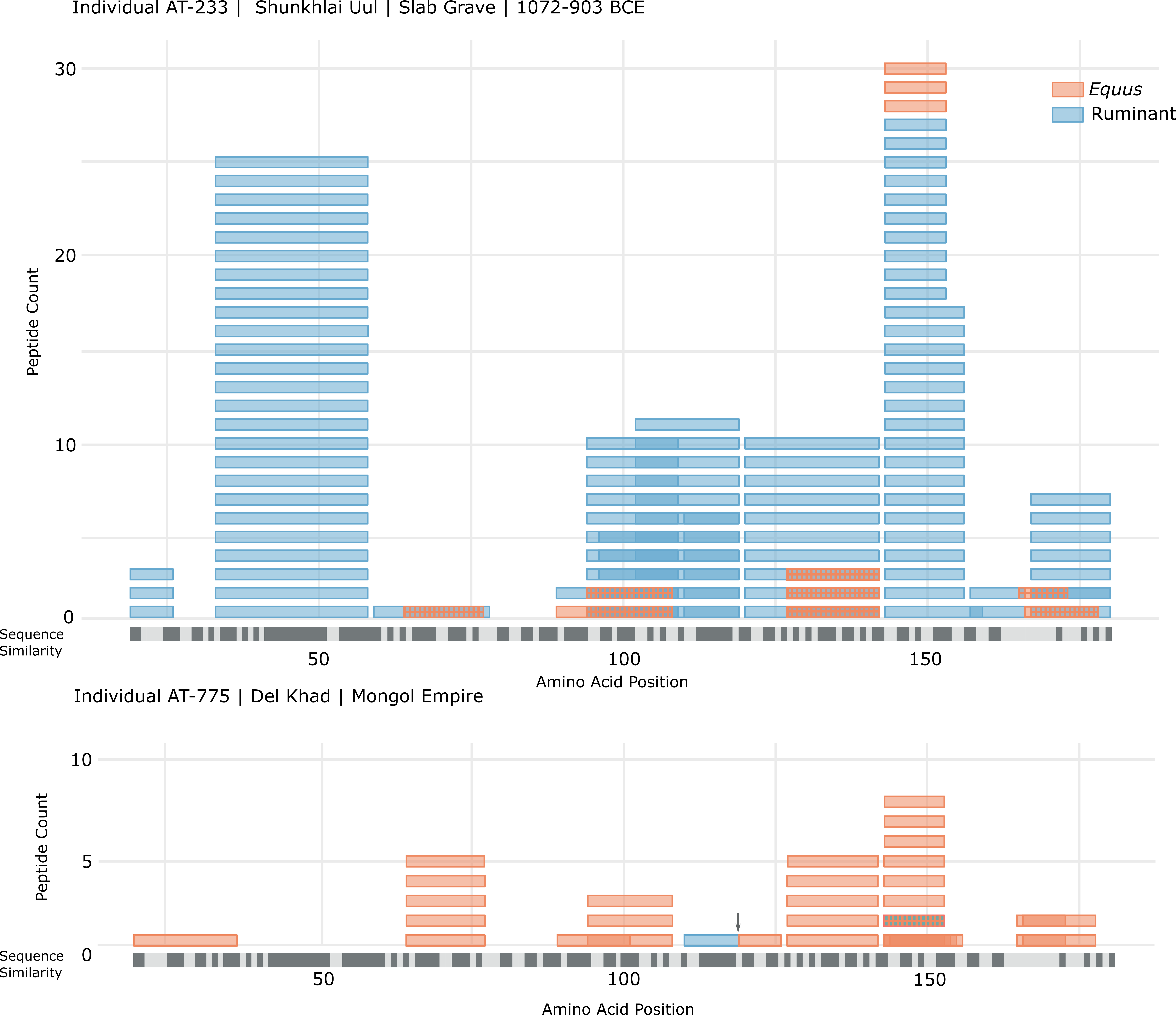 НТӨ 1200 оноос хойших хүрэл зэвсгийн үеийн дурсгалуудаас олдсон эртний дөрвөн хүнийг шинжлэн үзэхэд бүгдэд нь сүүний хэрэглээний ул мөр илэрсэн юм. Бид хивэгч малын сүүний 2 уурагны (бета-лактоглобулин (BLG), альфа -С1-казеин) пептидүүдыг тодорхойлсон бөгөөд мөн нэмж альфа лактальбумин, бета-казеин гэх 2 уурагнаас хивэгч малын сүүний пептид олж илрүүлсэн. Хивэгч малын сүүний уургаас гадна, тэдгээр дөрвөн хүний хоёроос нь гүүний сүүнд өвөрмөц тохиолдох бета-лактоглобулин – I болон II уургийн (гүүний сүүний бета-лактоглобулин уураг нь 2 паралоги генээс үүсдэг) пептид олсон нь гүүний сүүний (Экүүсийн төрөл ) хамгийн анхны палеопротеомик нотолгоо (эртний уургийн нотолгоо) болж байгаа юм. Шунхлай уулын дурсгалаас (НТӨ 1200) олдсон эртний нэг хүнд хивэгч малын бета-лактоглобулин уургаас 126 пептидийн спектрийн оноолт /ПСД/ байсан бол 50 нь гүүний сүүний бета-лактоглобулин уургийнх (Дүрс 3), 9 пептид альфа -С1-казеин, бета-казеин болон альфа-лактальбумин уургуудынх байв.