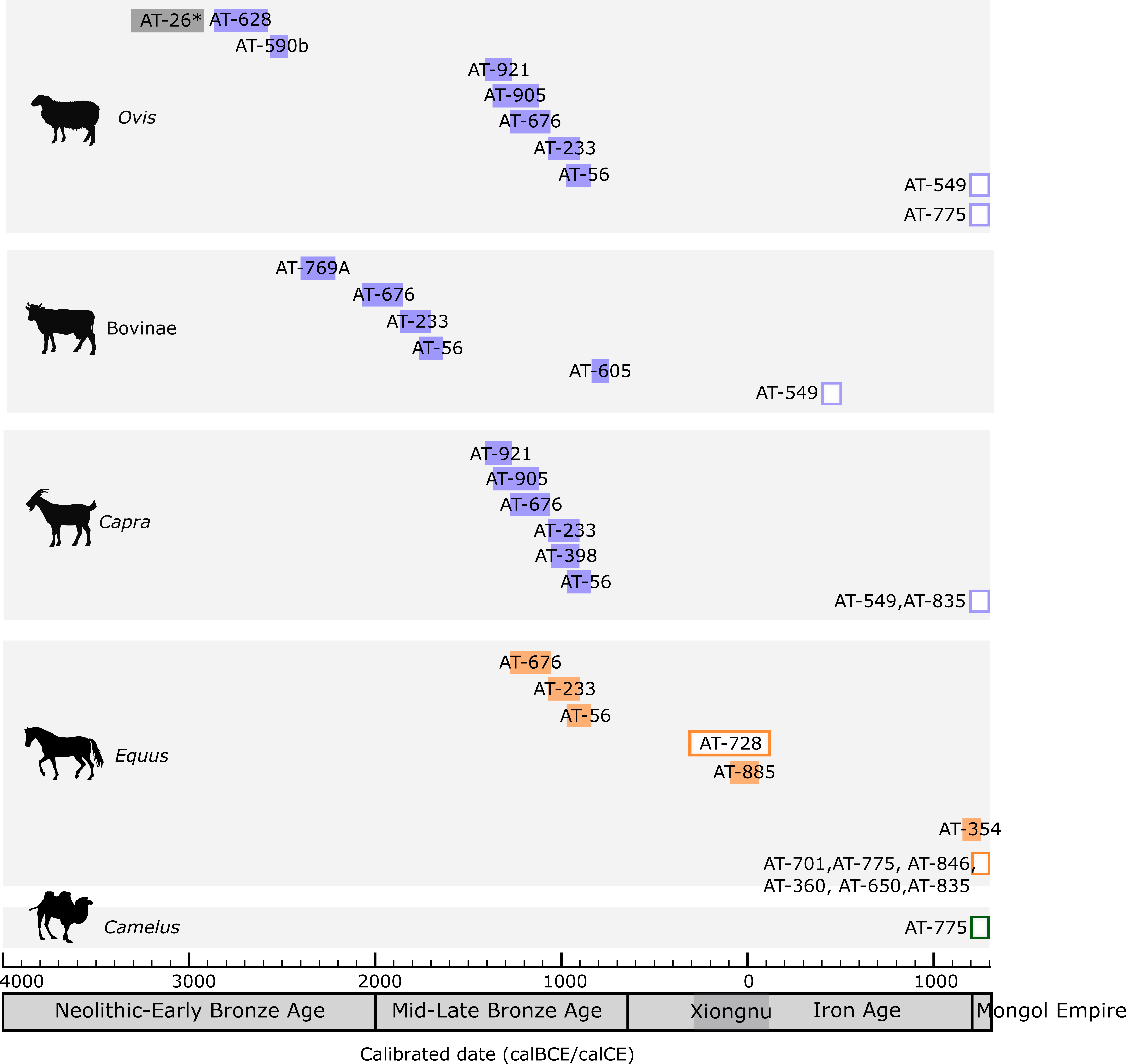 Equus, Capra, Bovinae/Ovis* (Адуу, ямаа, үхэр/хонины төрөл*) |