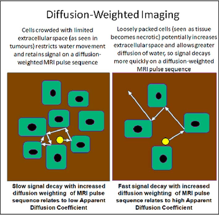 Diffusion-weighted (DW)- MRI, developed for brain imaging more than a decade ago, derives image signals from the movement of water molecules, mainly within the spaces outside cells. The less freely water can move-for example in cancer tissues where cells are crowded together and the space around them is limited- the more signal is retained in DW-MRI, and the brighter the tissue appears.