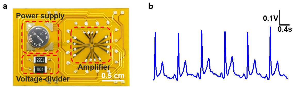 Figure 2. a, Photograph of the amplifier module, with a coin battery, a voltage divider and amplifier circuit integrated on a flexible circuit board. b, Amplified ECG signal of a human subject.