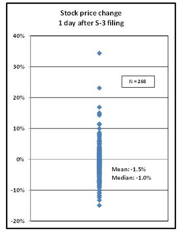 - The immediate market sentiment to the filing of an S-3 statement tends to be slightly negative, as suggested by 1 day stock movements in the context of broader market movements. That said, the price changes are usually less than 10%, which a long-term investor can generally accept.