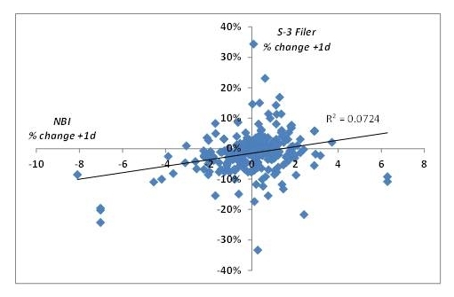Similarly, John Dyer of advisory firm Aquilo Partners asked, “What’s the normalized stock price reaction (filing + one day, + 5 days) to a shelf filer?” and “What is the normalized return of shelf users from filing?”