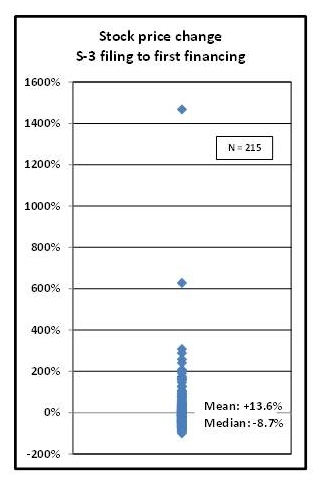 Of the 268 S-3 filings, 215 companies subsequently raised money. Slightly less than have half, or 94/215 (~44%), raised subsequent money at share prices higher than the share price at the time of the S-3 filing. The range in share prices at the first financing varied dramatically, however. As can be seen in the plot in Figure 3, the range was -91.4% to +1,467%, the average change was +13.6%, but the mean was much lower at -8.7%, indicating the effect of positive outliers. Indeed, price decreases are limited to 100%, but share increases are theoretically limitless.