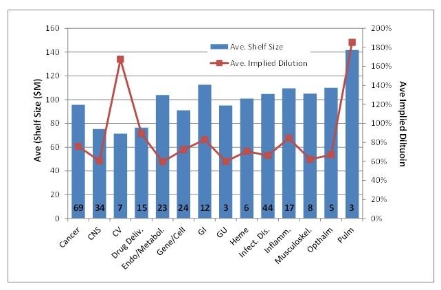 I needed to go back and do some additional work for this question. To avoid the subjectivity of categorizing companies’ therapeutic area, I simply used the classification scheme put forth in each quarterly and yearly roundup issue of BioCentury. I realize that many readers do not have access to this industry publication, but suffice it to say that in these summary issues, the editors of BioCentury sort the majority of public biotech companies by therapeutic focus area. In Figure 4 are the data of S-3 filers, sorted by BioCentury classification, on shelf size and “implied dilution,” or the ratio of shelf size to market cap at filing. There may be hints of differences among companies focused on cardiovascular (CV) and pulmonary (Pulm.) regarding use of S-3s, but the sample sizes (Ns) are somewhat small in those categories. Otherwise, across therapeutic areas, it appears that implied dilution is in the 60-80% range on a shelf size of $50-$75 million dollars. (Recall that I define implied dilution as the ration of shelf size to market cap at the time of filing. The implied dilution is therefore a measure of the dilution that current shareholders would experience if all of the securities in the shelf were issued.)