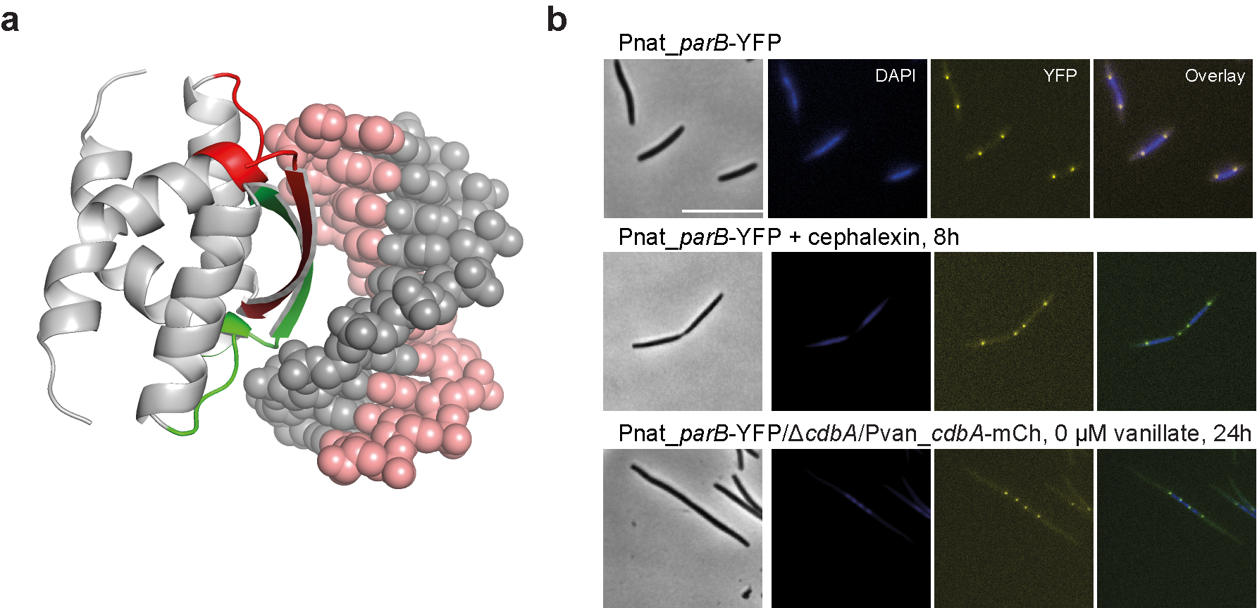 Figure a. CdbA dimer interacting with DNA with the two interfaces identified by HDX to be involved in c-di-GMP binding colored in red and green. b. Images of representative cells showing a DAPI staining of the nucleoid and ParB-YFP localization as a marker of origin of replication of CdbA depletion strain in comparison with wild-type strain and wild-type strain blocked in cell division with cephalexin. Scale bar, 10 µm.