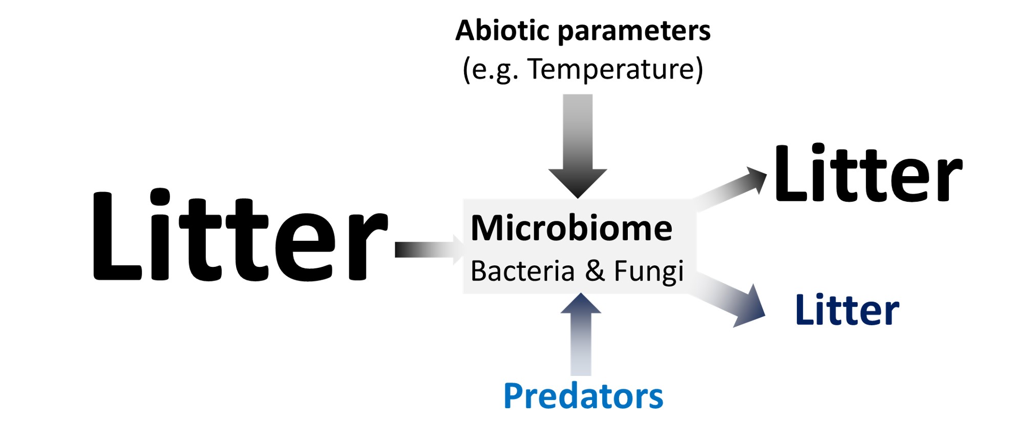 What can we deduce from this experiment that we just published in The ISME Journal: Microbial decomposition is not only controlled by differences in abiotic properties such as the well-known factors of temperature or water content (just imagine the slow decomposition rate in the tundra that safes our planet from access CO2 release), but also by biotic factors, in this case predation! Of course, our experiment is super simplistic and rather artificial, as natural systems contain plenty more microorganisms, protists and other organisms under more abiotic variation than explored here. Still, our experiment suggests that microbiome predation is a major driving factor of decomposition especially in cold or temperate places where the bottom-up abiotic factors that stimulate decomposition are less strong (Fig. 2).