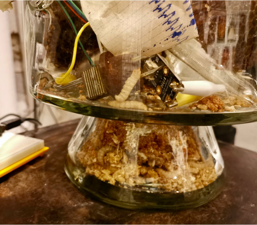 Together with conservator Amalie Schjøtt-Wieth, I introduce a population of wax worms to their new home inside an art installation – Worm dome – developed together with artist Eduardo Abrantes. We are sitting at a table wearing gloves and transferring one worm at a time from their feeding boxes to a glass desiccator. Desiccators are sealable enclosures used to preserve moisture sensitive materials. Inside, Eduardo has furnished the desiccator with plastic waste from a local lab for the worms to eat, discarded medical objects and analog sensors to transform the worms’ eating, digestion and excretion into a soundscape. A soundscape intended to connect visitors to the metabolic processes going on inside the installation. While handling the worms resembles Amalie’s usual work as a conservator, she describes how museum objects usually don’t flee out of her hands. We are essentially practicing museum care in reverse: Torn between creating a livable habitat and protecting the museum. For Amalie, the desiccator provides a meeting point between these objects of care connected by the sealant she uses to secure the lid, so no one accidentally lets the worms out. Yet sealing the desiccator also proves fatal as time progresses making it almost impossible to respond when the worms begin dying a month later.