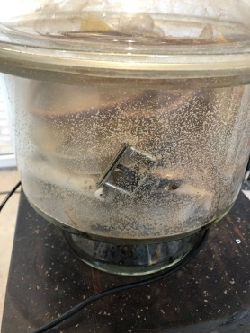 Just before The Living Room closed, we revisit Worm dome to explore the uncertainty of its ending as a living decomposing installation. Together with archaeologist Tim Flohr Sørensen, we “excavate” it as a mode of care paying it a final respect by noticing its transformations and differences from our initial intentions. On a bright but windy day, we “excavate” Worm dome in the courtyard at Medical Museion. The wind turning into an agent of change as we smash the lid (the only option to get in there…) and begin to organize objects on a table. The wind particularly asserting its agency as I let the sugar mites, by now so central to the installation, blow away. Inside the installation we find entangled objects sticking together in various constellations resting on a smelly mud-like ground. I take a sample of this smelly material and with the help of scientist Jakob Blæsbjerg Hoff identify an extremophile fungus living inside our installation: Aspergillus Glaucus – a robust fungus that can survive in a variety of different environments. This new inhabitant emphasizes how the installation was (trans)formed by multiple uninvited microbial agencies reiterating the forces of a life uncontainable.