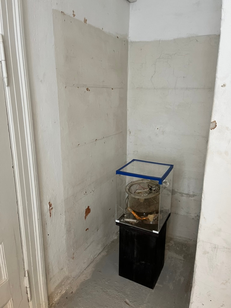 After another Covid-shutdown, we return to The Living Room to find Worm dome in a decomposing state. The bottom of the installation is blackish and mouldy, and residues cover the objects inside. Sealed and fragile the desiccator-environment marks our inabilities to control even such a small space. As we gaze in from the outside, we find comfort realizing that it is turning into a compost of rot and microorganisms granting it a new life.