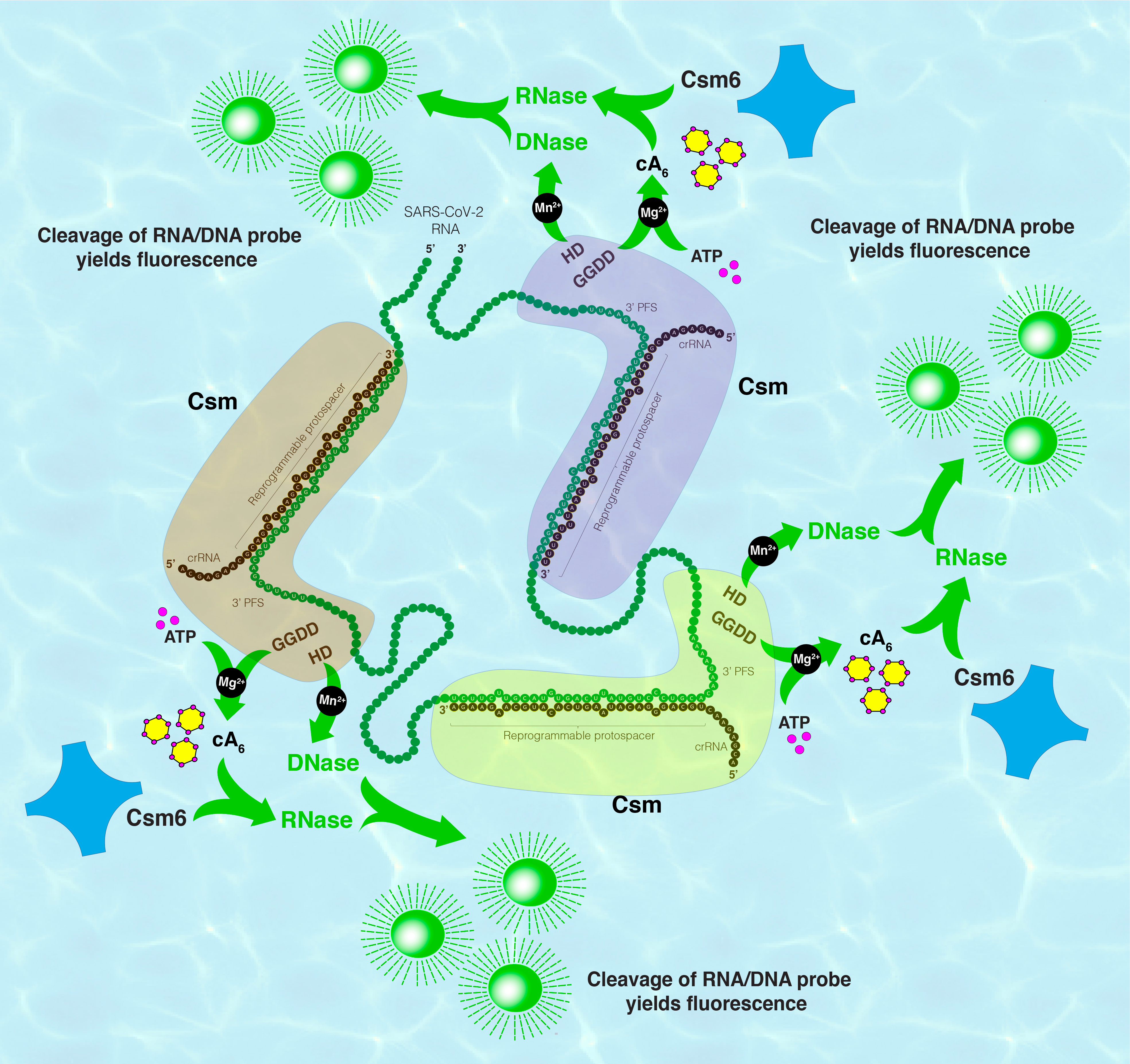 We were fortunate to have the availability of an all-in-one expression system for a Csm complex from our long-time collaborator, Prof. Michael Terns at the University of Georgia,2,11 that made it convenient to re-program and produce Csm in large quantity. Among the five subunits of Csm, Csm1 harbors both a DNase and an adenylate cyclase functionality upon viral RNA stimulation. The synthesized cyclic hexaadenylates (cA6) from ATP2 act as second messengers to allosterically activate another collateral RNase Csm612-14. Thus, a tandem Csm-Csm6 system programmed against SARS-Cov-2 RNA is capable of cleaving fluorescent DNA and RNA probes upon encountering the SARS-CoV-2 RNA present in patient swab RNA extracts (Fig. 1). Such a Csm-Csm6-based virus detection platform greatly benefits from the augmentability of the inherent dual collateral activities stemming from the Csm1 subunit and signal amplifiability by Csm6 via supplied oligonucleotides. We named this multifaceted, versatile but simple system: MORIARTY for Multipronged, One-pot, target RNA-Induced, Augmentable, Rapid, Test sYstem.