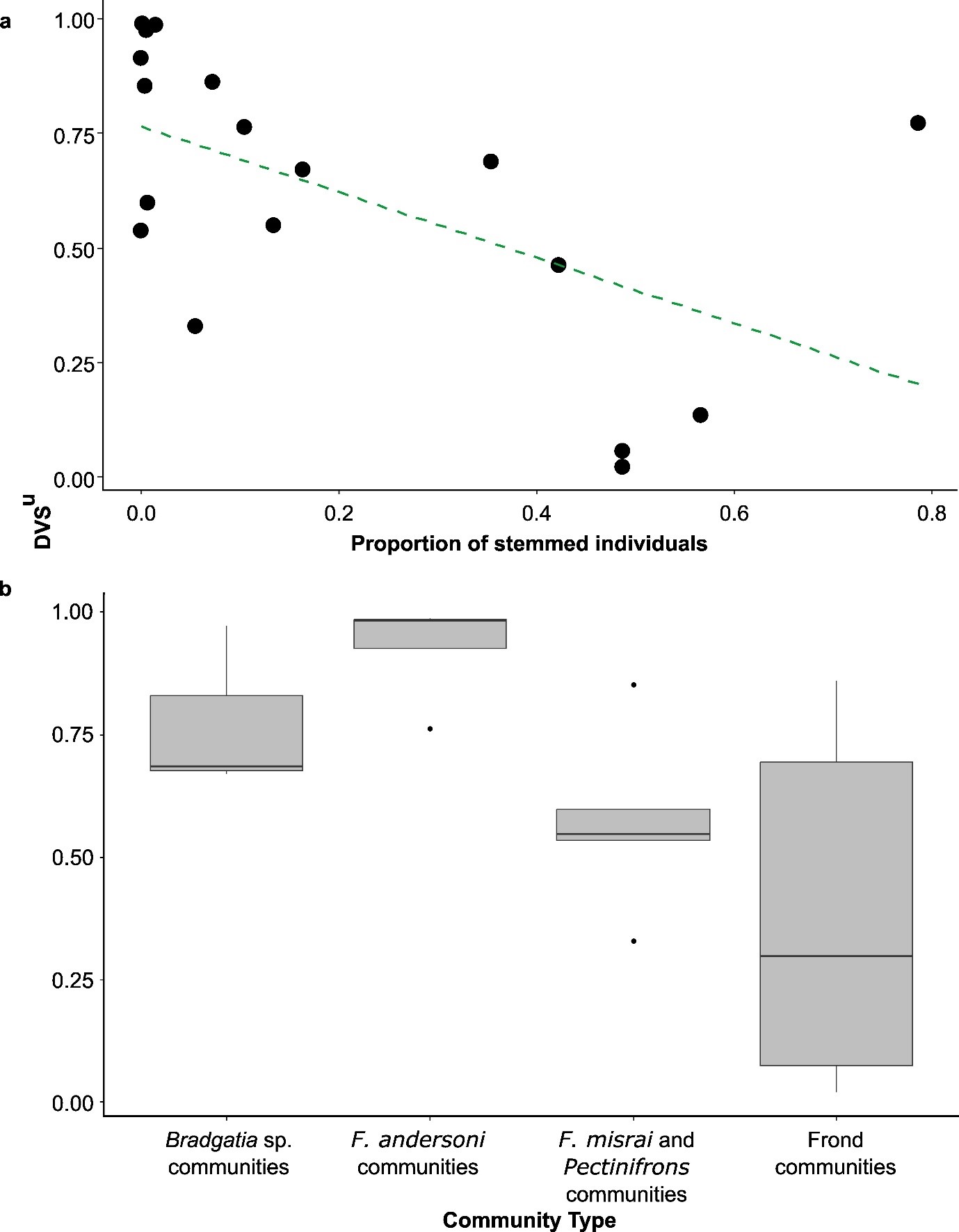 Caption: a) We found a negative correlation between tiering within a community and the proportion of each community that contained stemmed organisms. b) tiering was less prevalent in communities primarily composed of fronds (right box).
